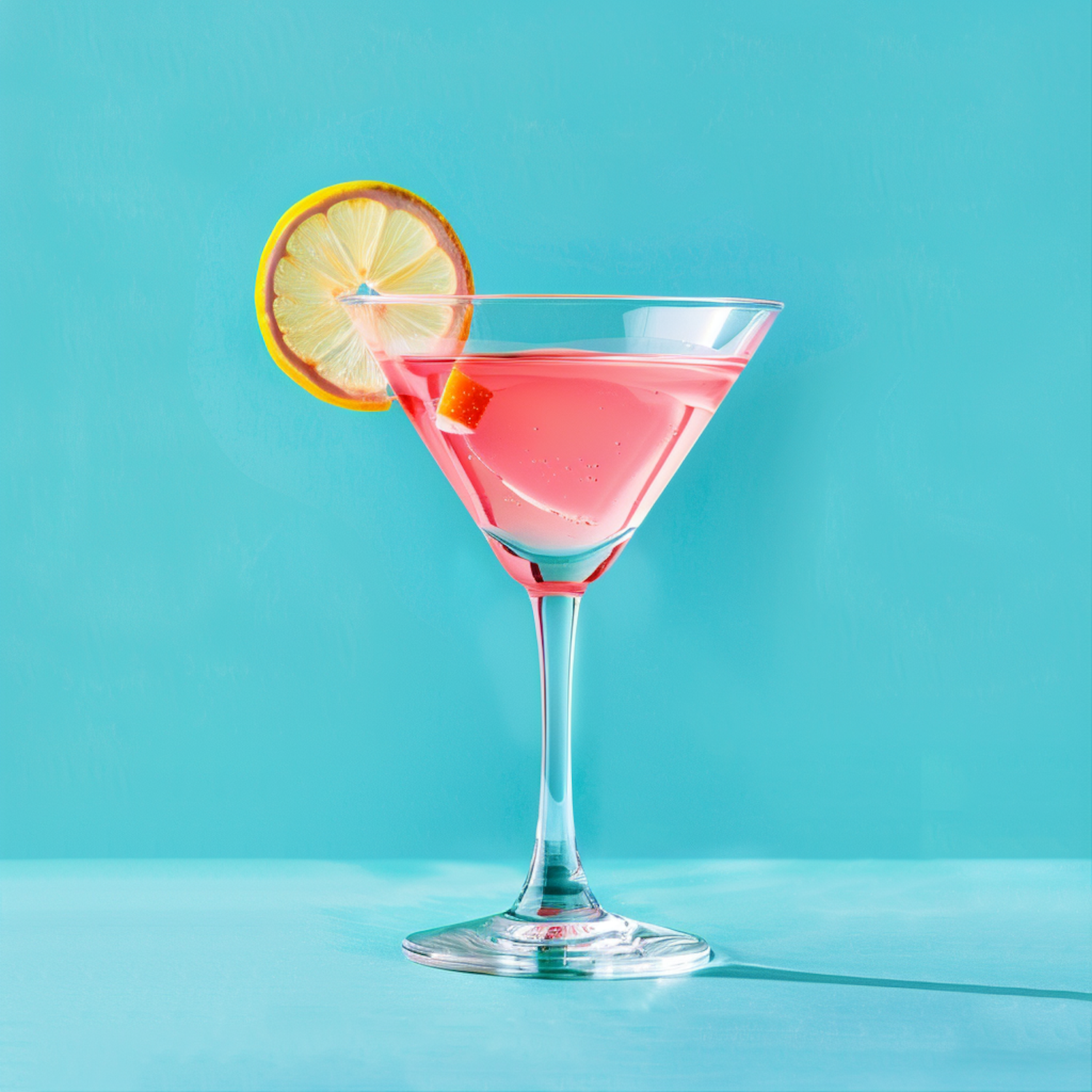 Vibrant pink cocktail in a martini glass with a lemon slice garnish against a turquoise background.