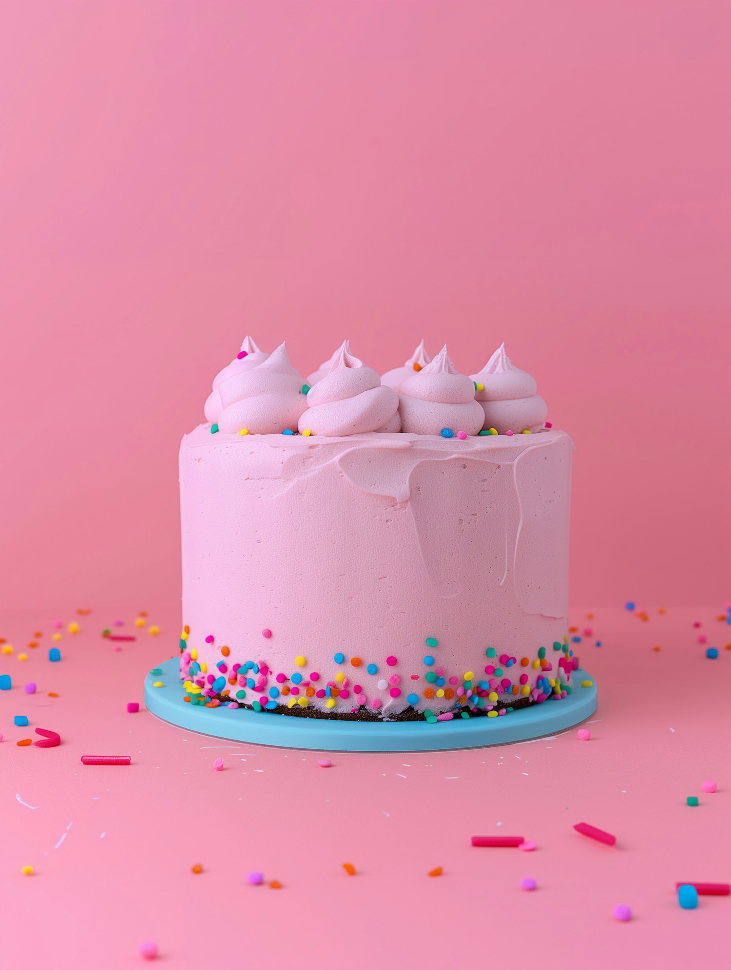 Pink frosted cake with colorful sprinkles on a blue board against a pink background. Whimsical and festive dessert display.