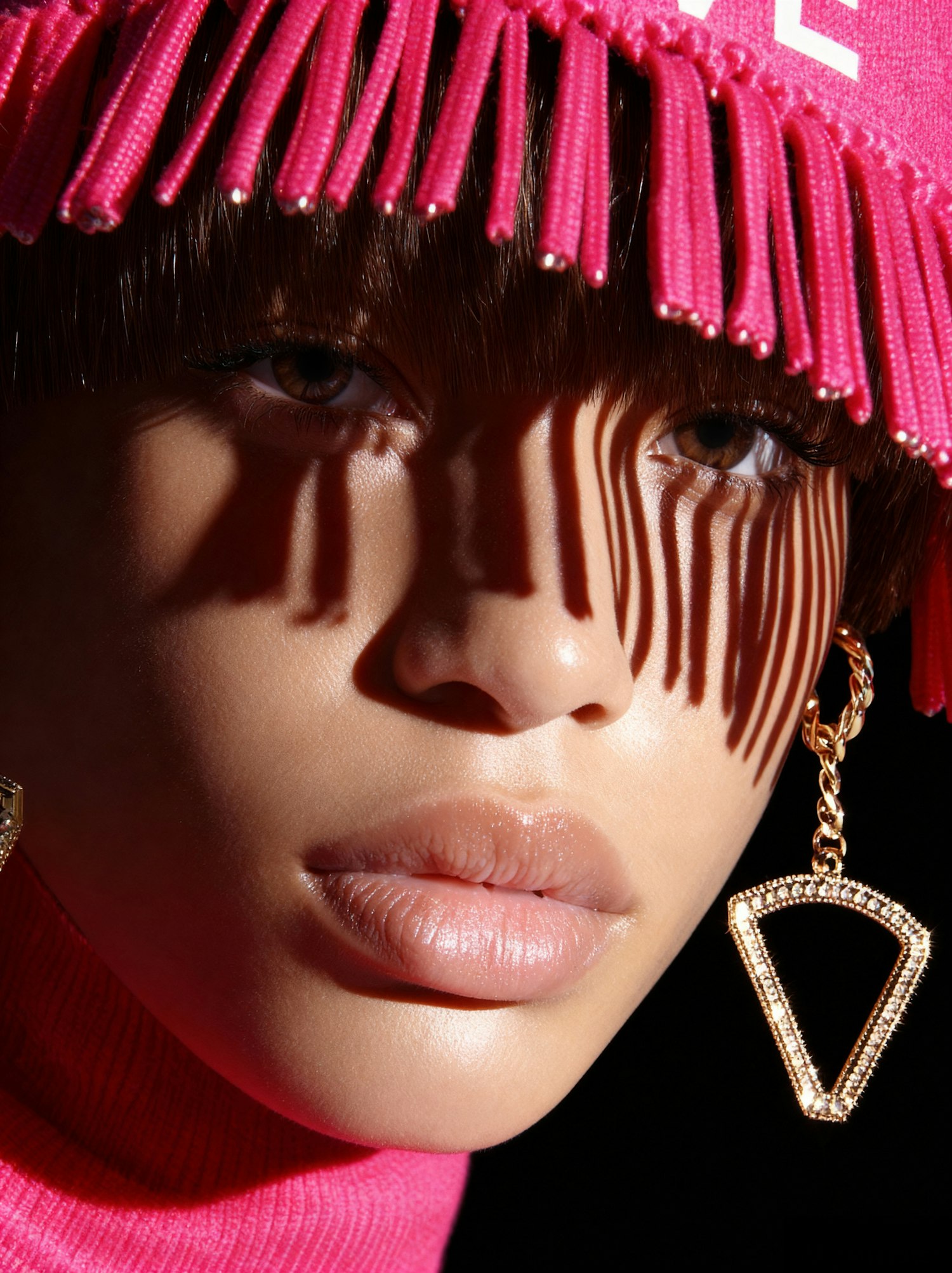Close-up of a person with a pink fringed hat casting shadows, wearing a gold geometric earring, and illuminated by dramatic lighting.