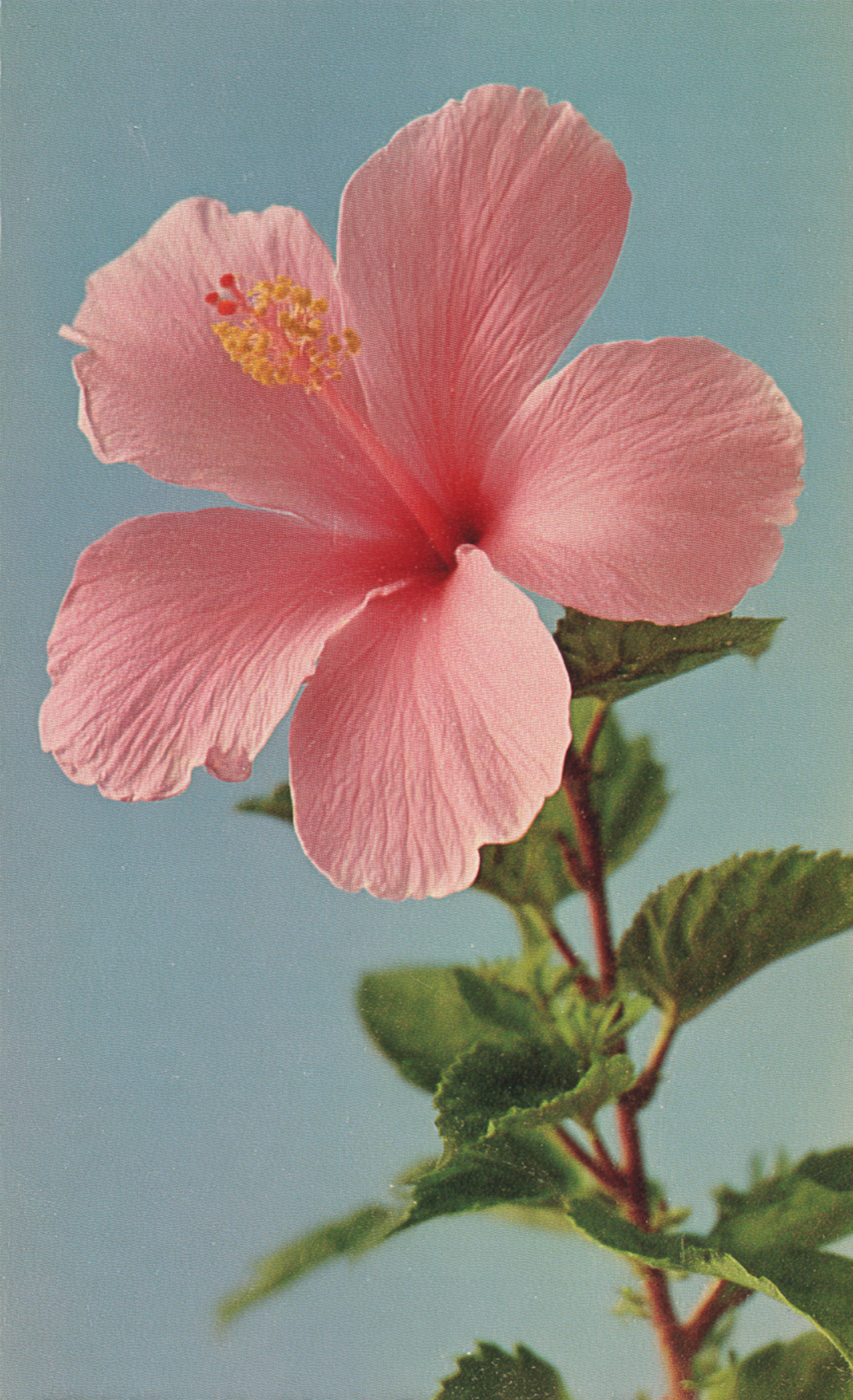 Close-up of a pink hibiscus flower with a vivid stamen against a light blue background, the vibrant hues conveying tranquility.