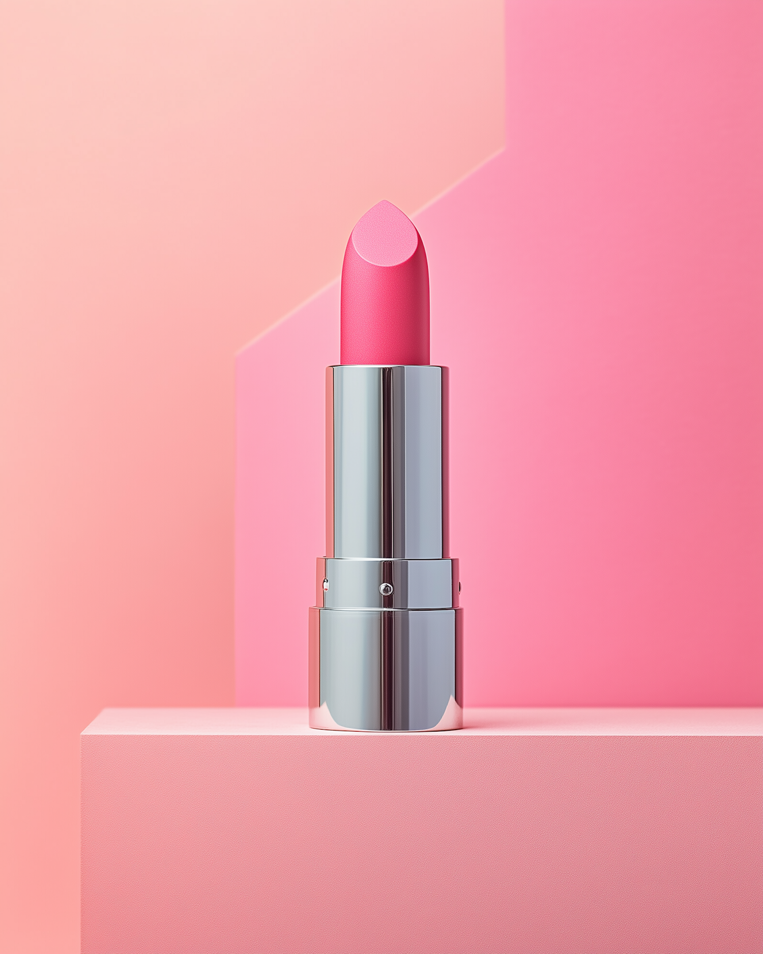 Vibrant pink lipstick in a sleek silver tube against a soft pink geometric background, exuding elegance and style.