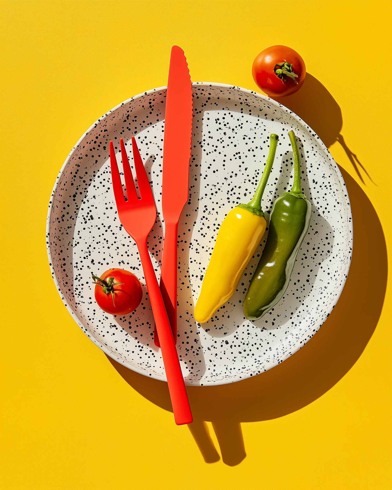 Colorful plate with peppers and tomatoes on a yellow background, featuring red cutlery for a vibrant, modern look.