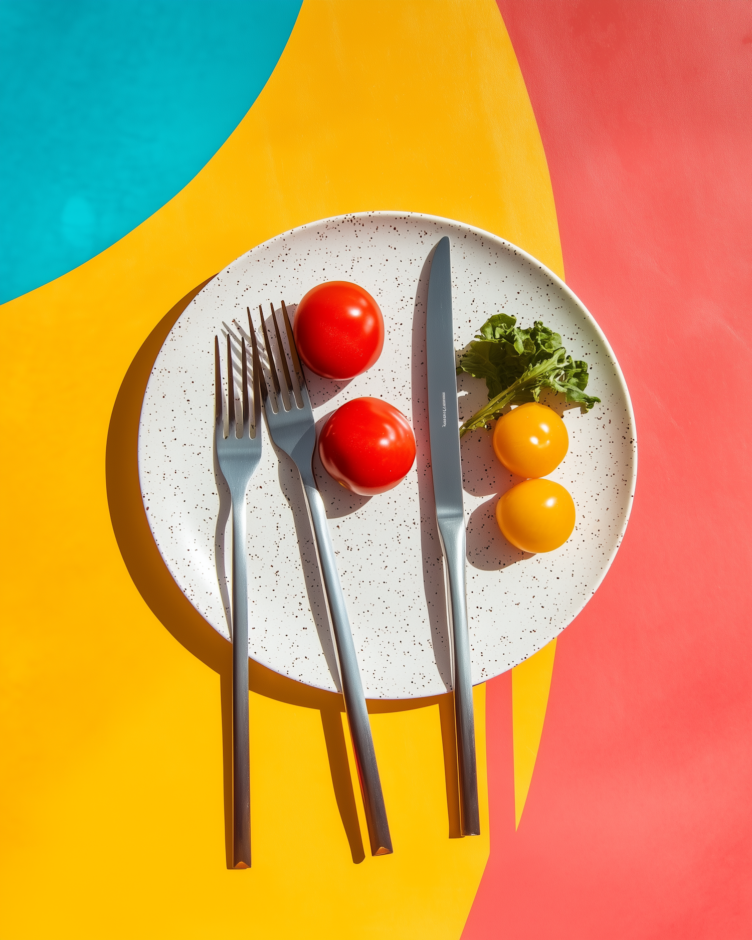Colorful plate with tomatoes and utensils on a vibrant yellow and red background, creating a lively and modern aesthetic.
