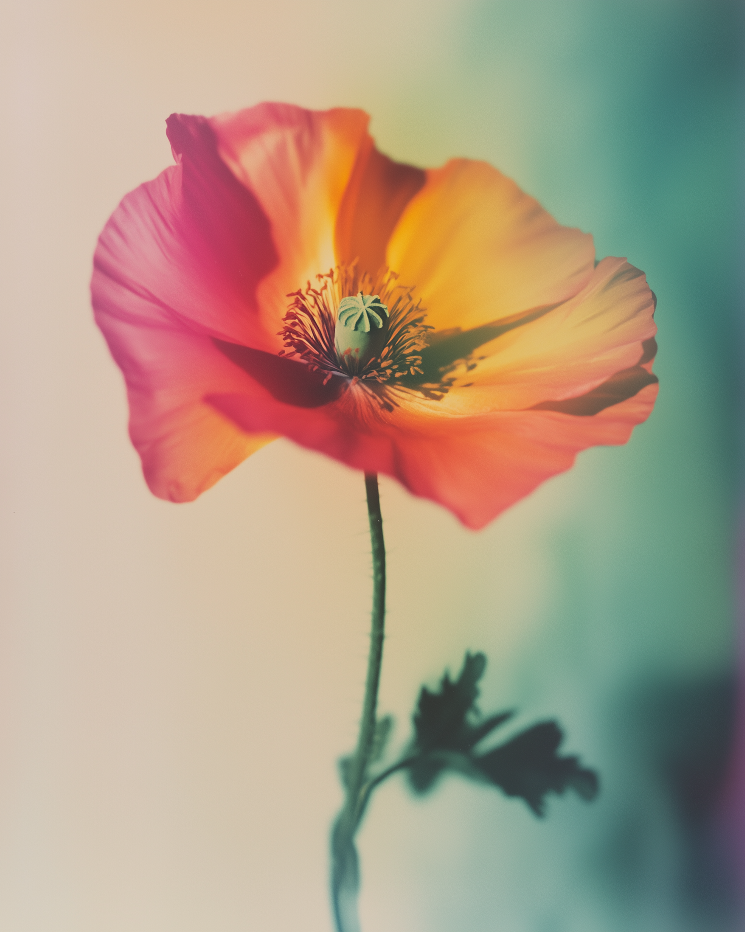 Vibrant poppy flower with orange and pink petals against a soft teal and beige background, showcasing natural elegance.