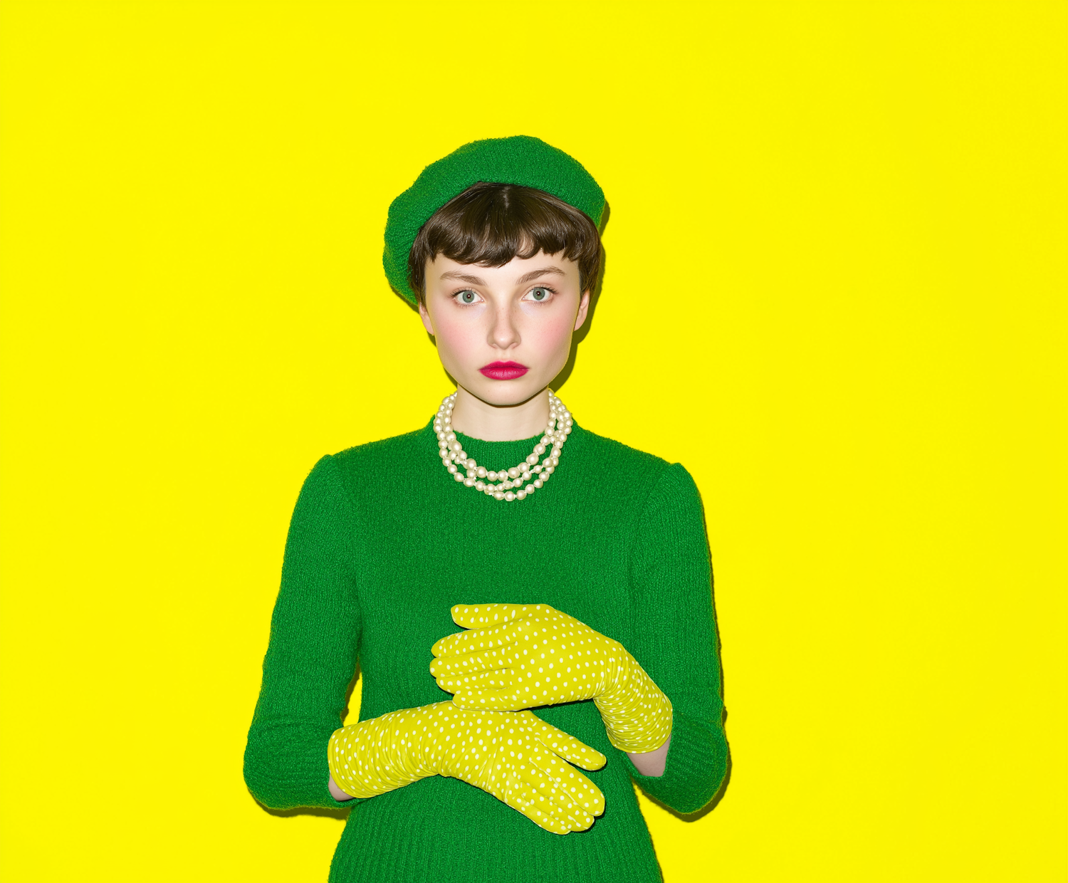 A stylish woman in a green outfit and yellow gloves poses against a bright yellow background, creating a bold and vibrant visual contrast.