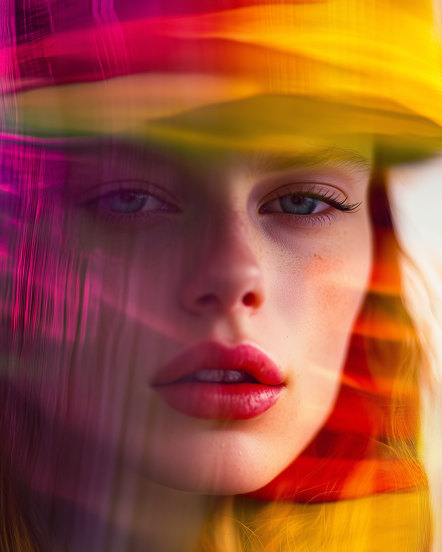 Close-up portrait of a woman with colorful overlay, featuring vibrant pink, yellow, and orange hues for an artistic effect.