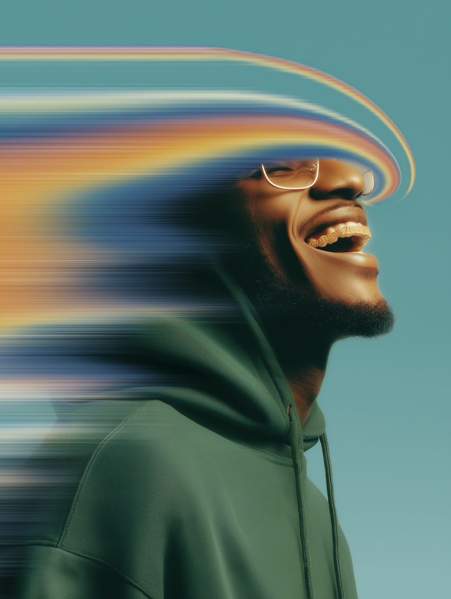 A vibrant portrait of a person in a green hoodie with colorful light streaks creating a surreal artistic effect.