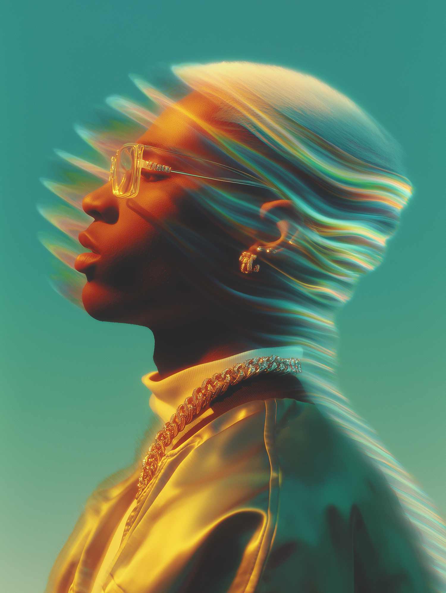 Stylized portrait of a person with glasses and jewelry, featuring vibrant distortion effects and a colorful background.