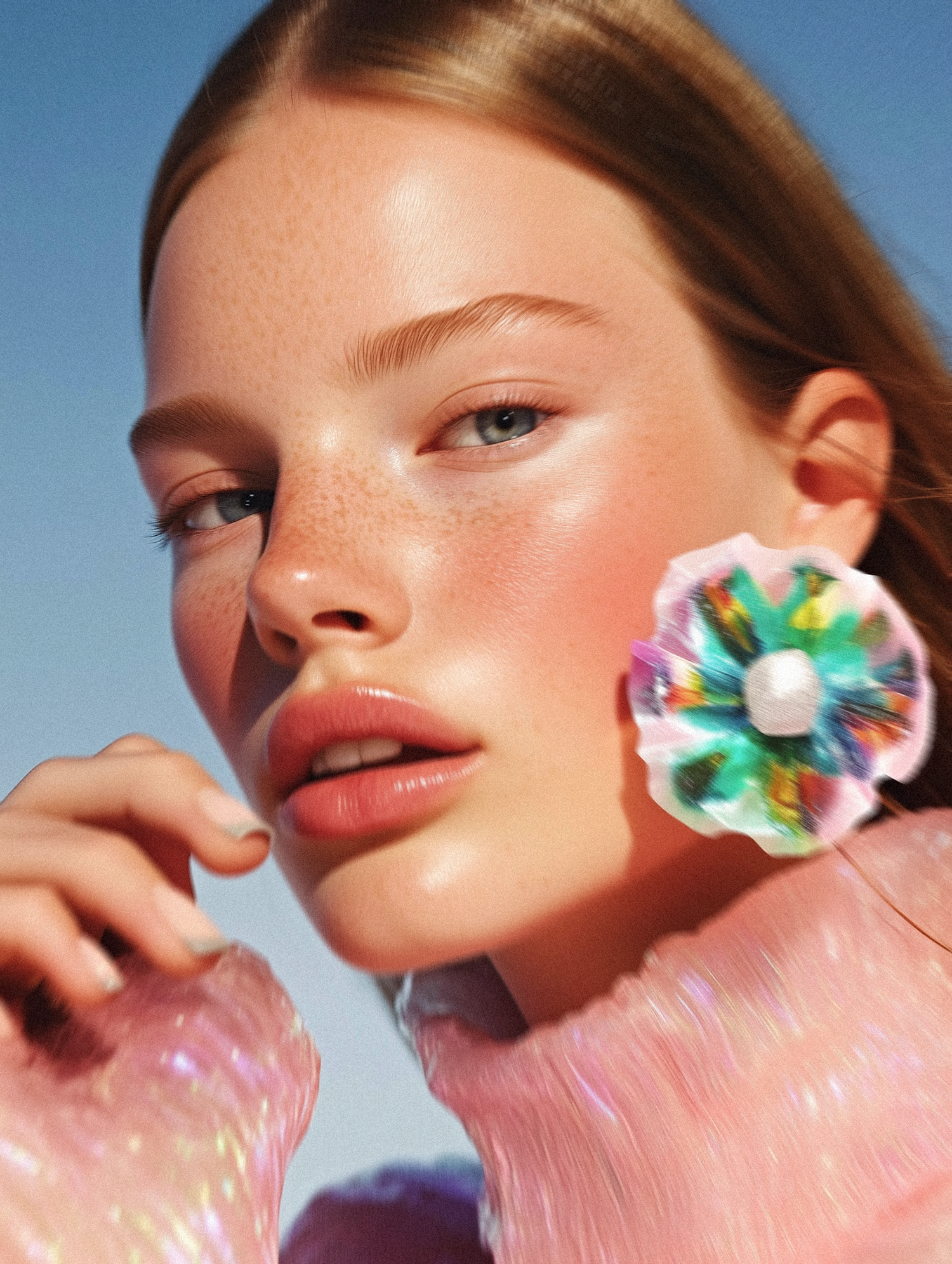 Close-up of a young woman with freckles, glossy pink lips, and a colorful flower earring, set against a clear blue sky.