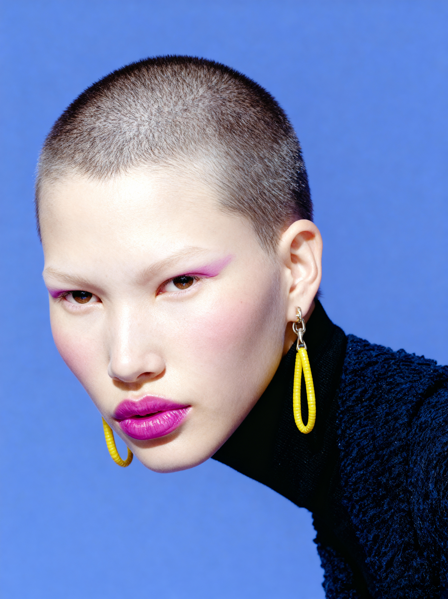 Close-up of a person with bold pink makeup, yellow earrings, and a shaved head against a blue background.
