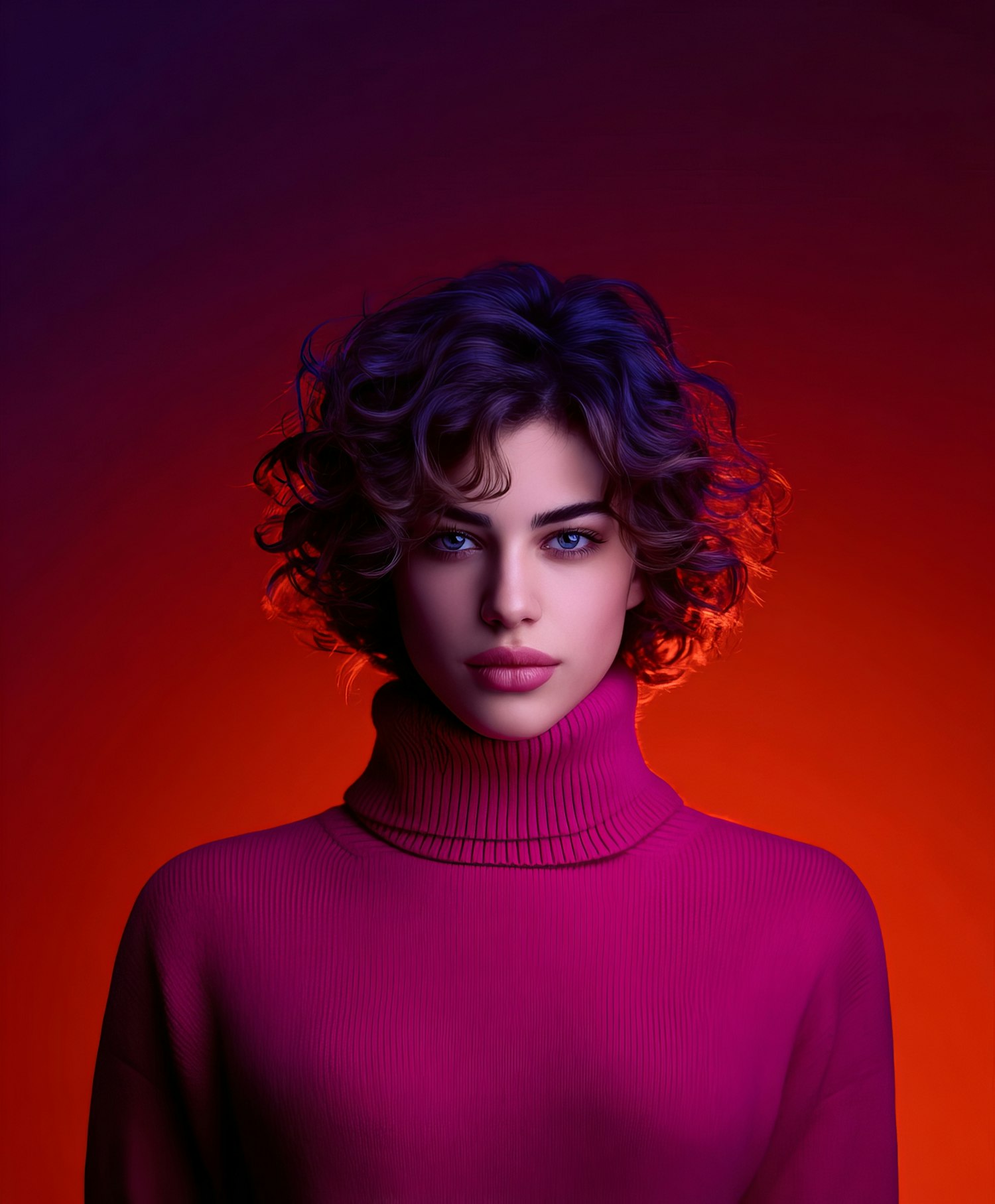 A striking portrait of a person with curly hair and blue eyes, wearing a magenta turtleneck against a vibrant red and purple background.