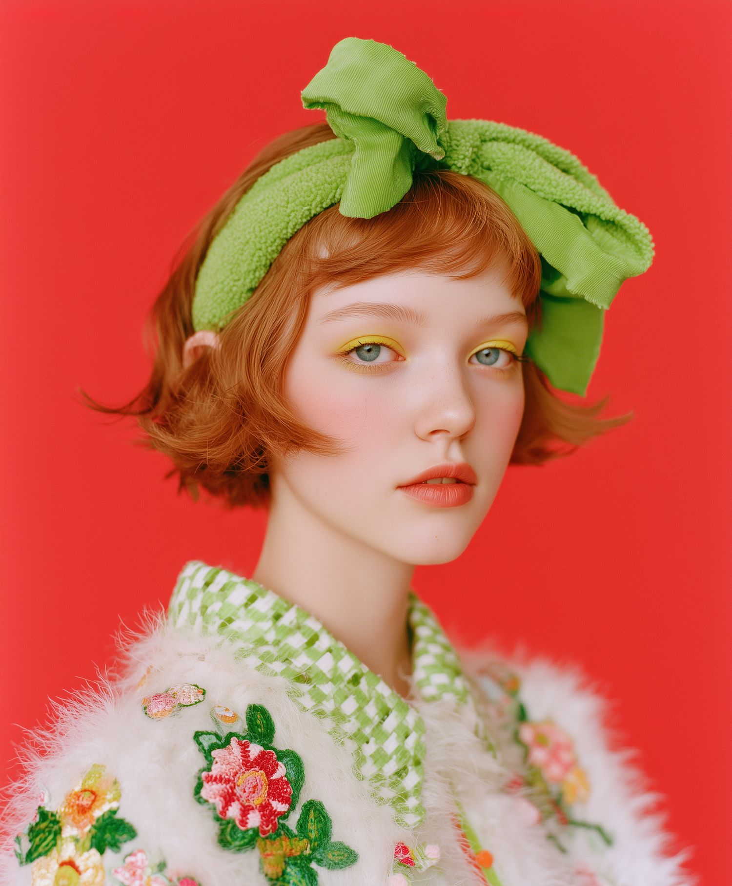A vibrant portrait of a woman with auburn hair, a green bow headband, and floral attire against a bold red background.