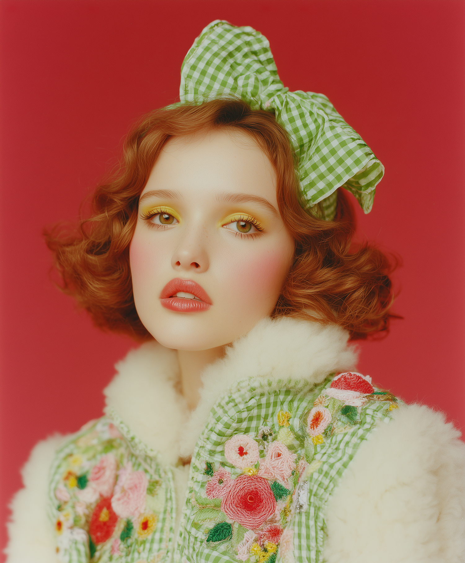A vibrant portrait of a woman with red hair, a green gingham bow, and a floral embroidered jacket against a red background.