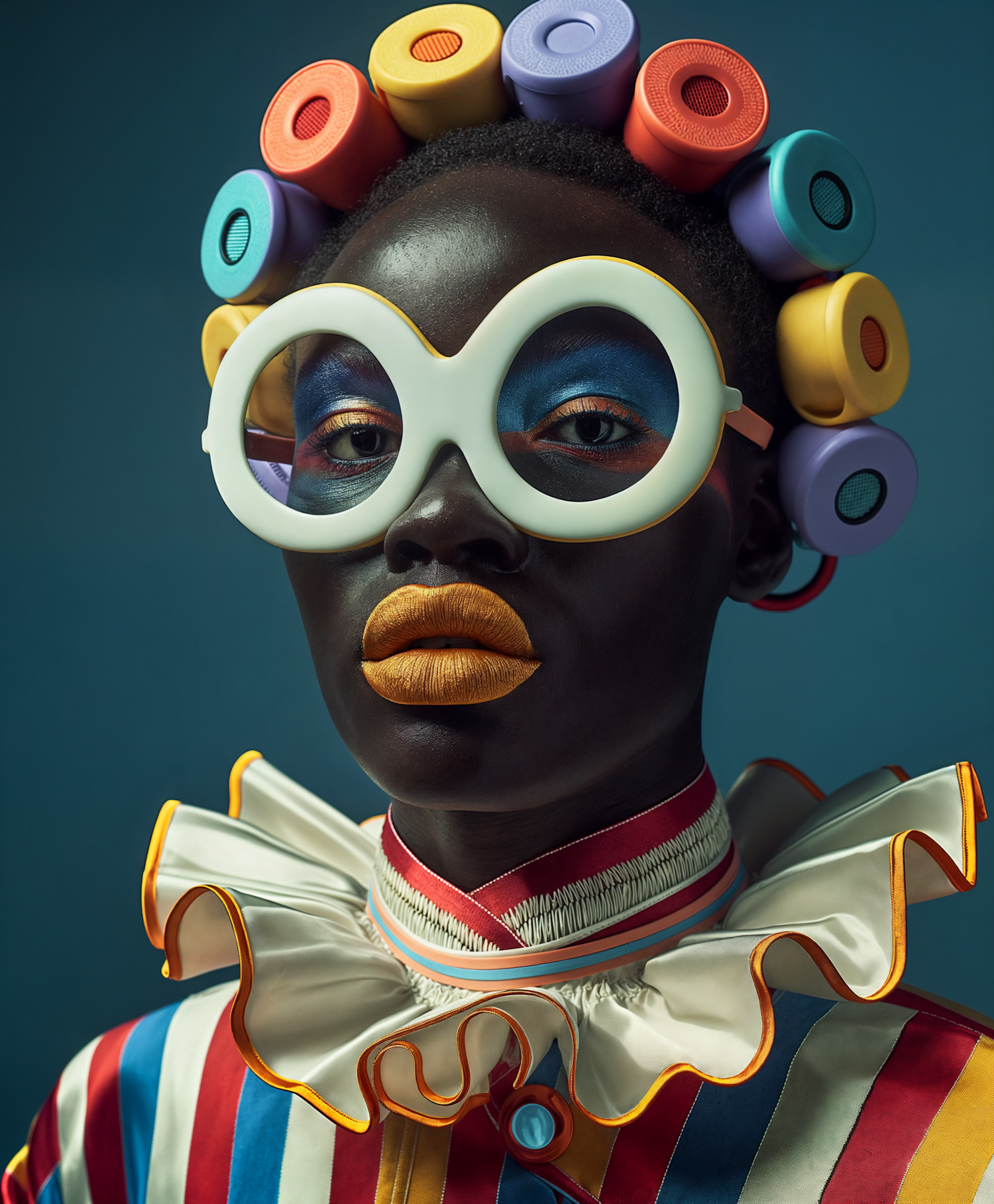 Vibrant portrait of a person with colorful curlers, bold makeup, and a striped outfit against a teal background.