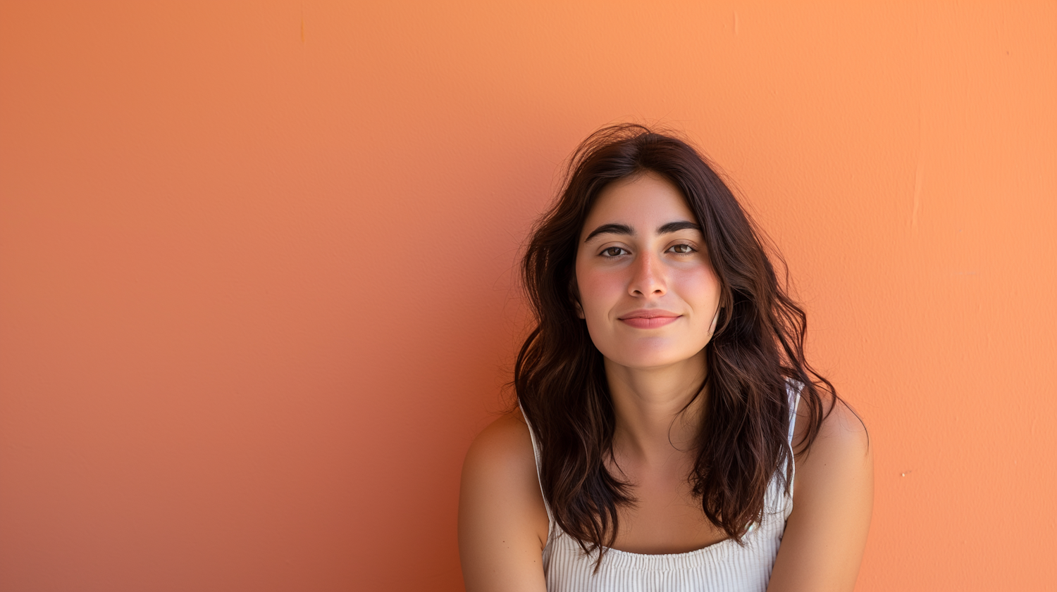 Young woman with dark hair and a relaxed smile against a vibrant orange wall, wearing a sleeveless top.