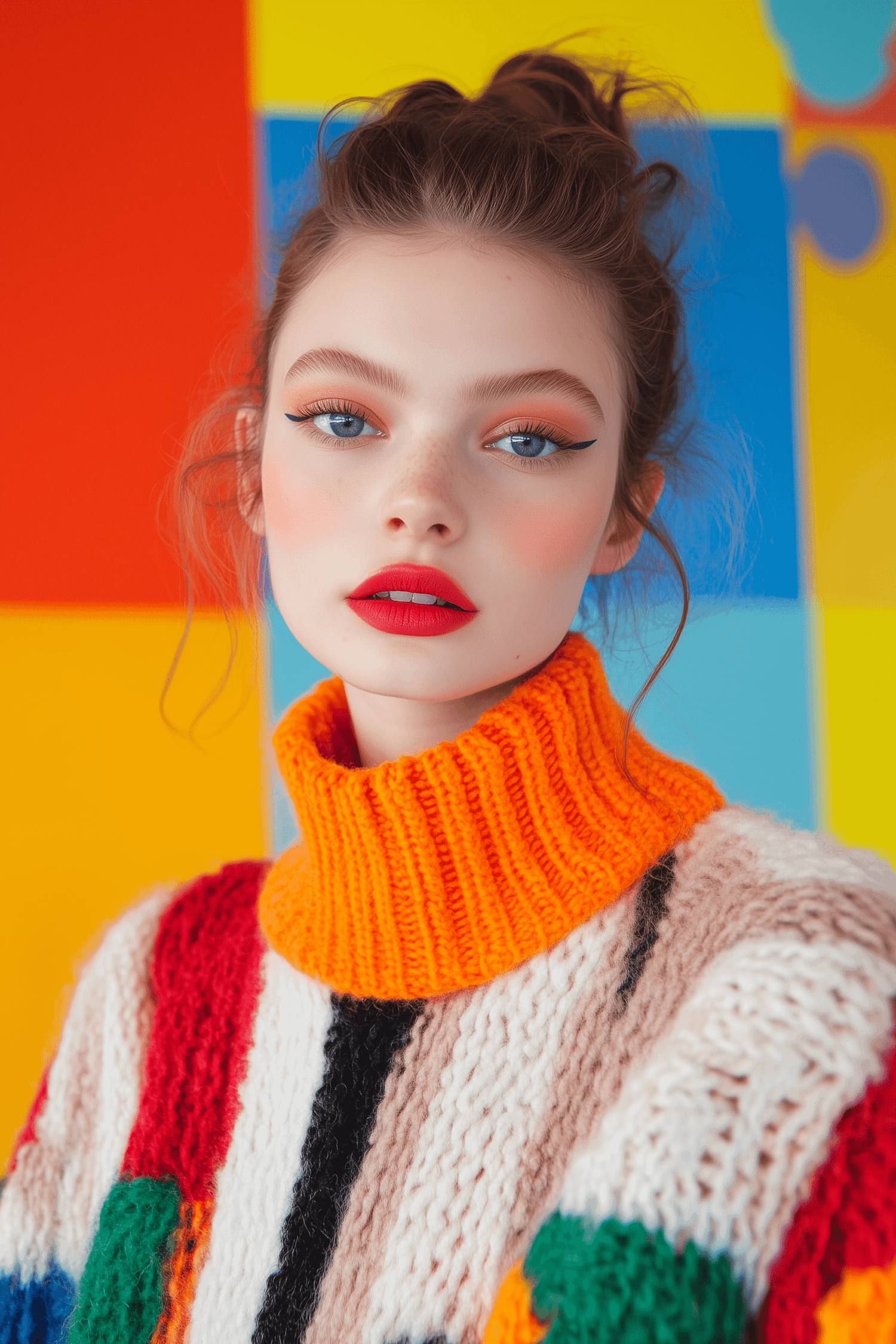 Vibrant portrait of a young woman in a colorful knit sweater against a bold, multicolored background.