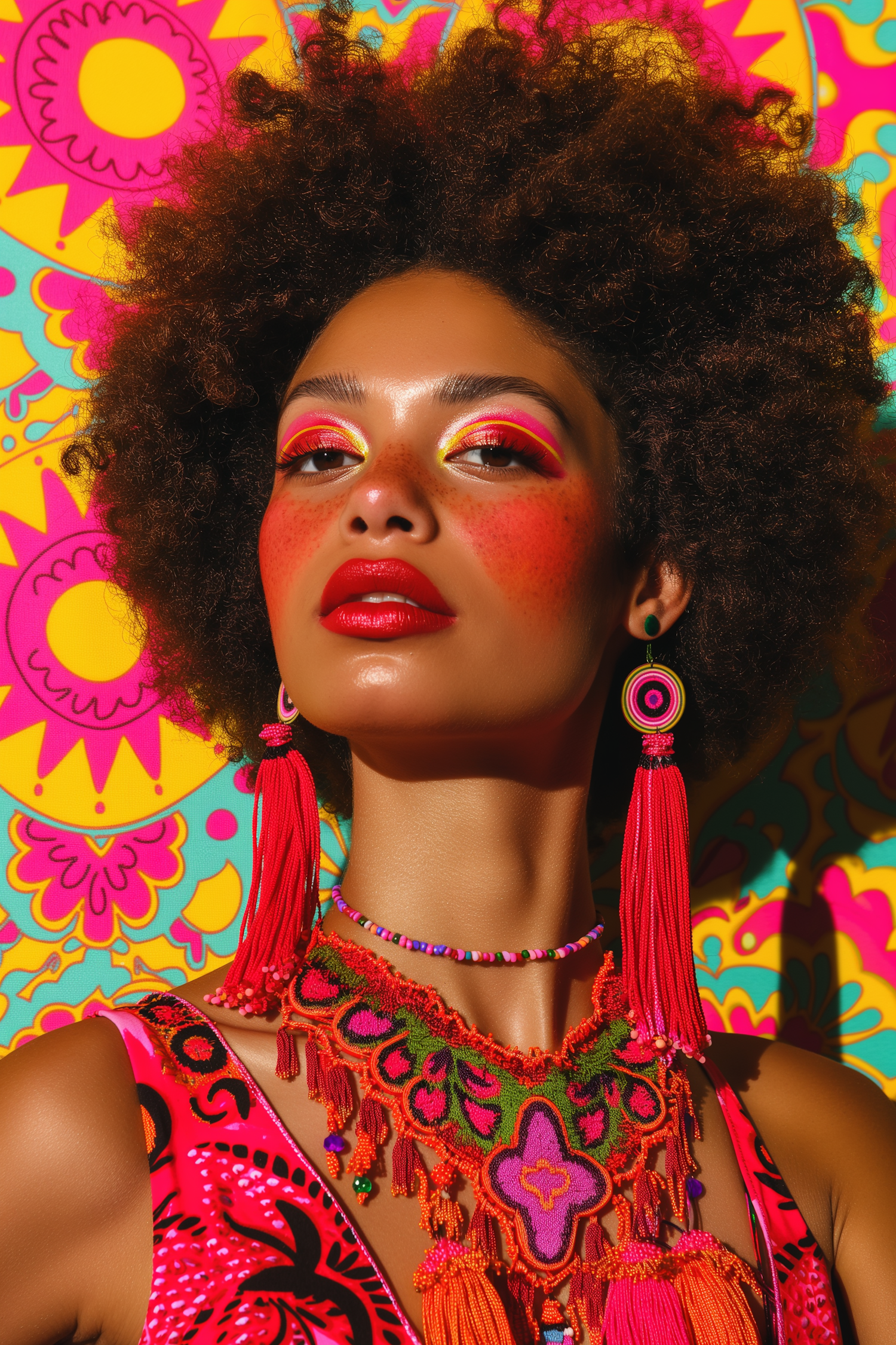 Vibrant portrait of a woman with bold makeup, colorful accessories, and a lively patterned background.