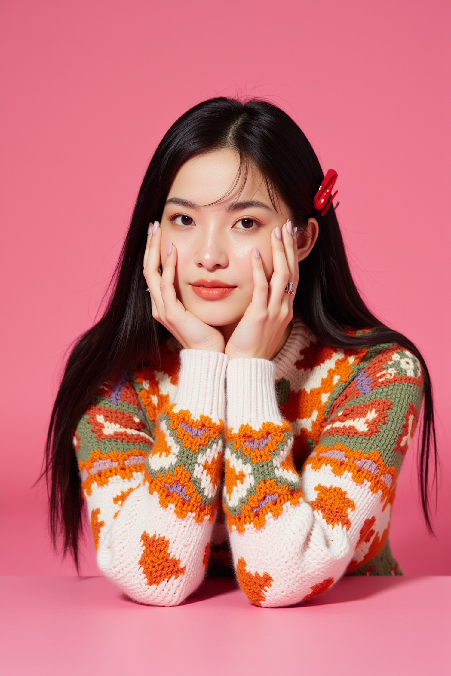 A young woman in a colorful sweater poses against a pink background, her hands on her cheeks, with a red hair clip adding a playful touch.