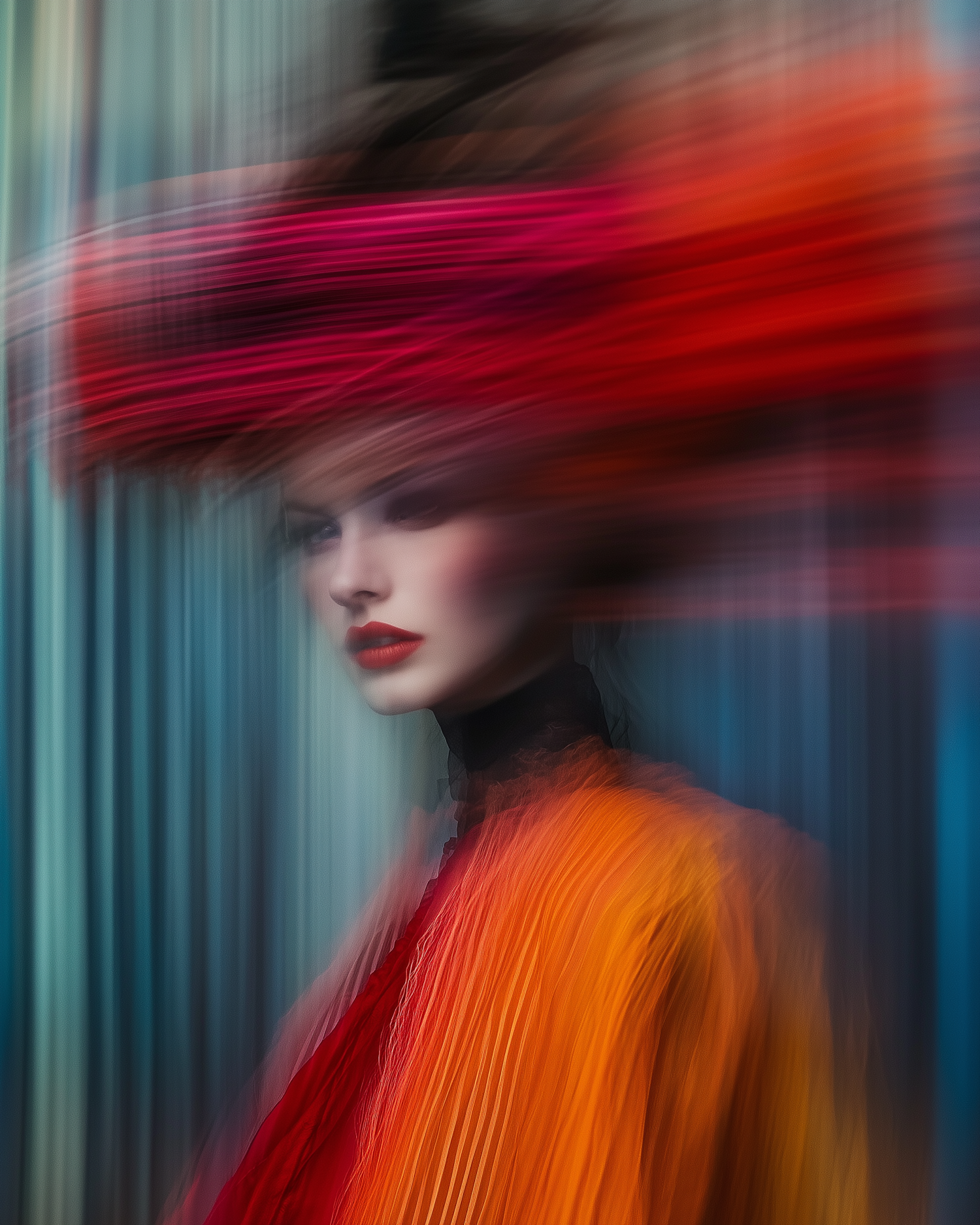 Artistic portrait of a woman in vibrant red and orange attire with a dramatic hat, featuring a blurred, surreal effect.