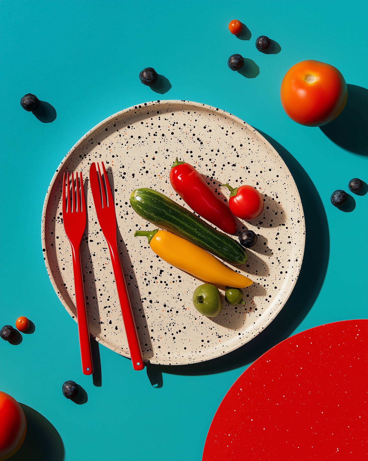 Colorful vegetables on a speckled plate with red forks, set against a vibrant turquoise background. Artistic and visually striking.