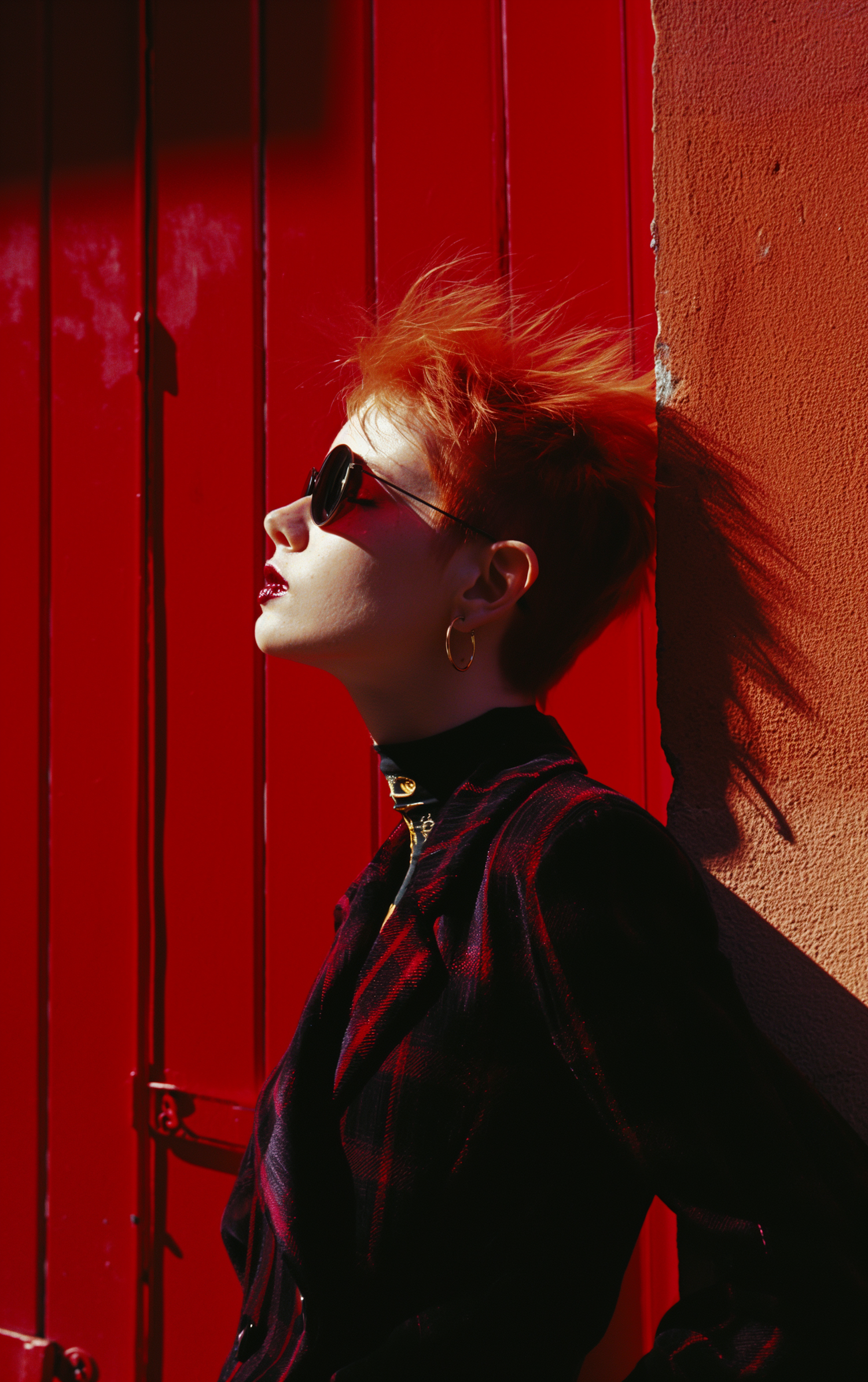 Stylish individual with red hair and sunglasses against a vivid red wall, wearing a dark jacket and gold accessories.