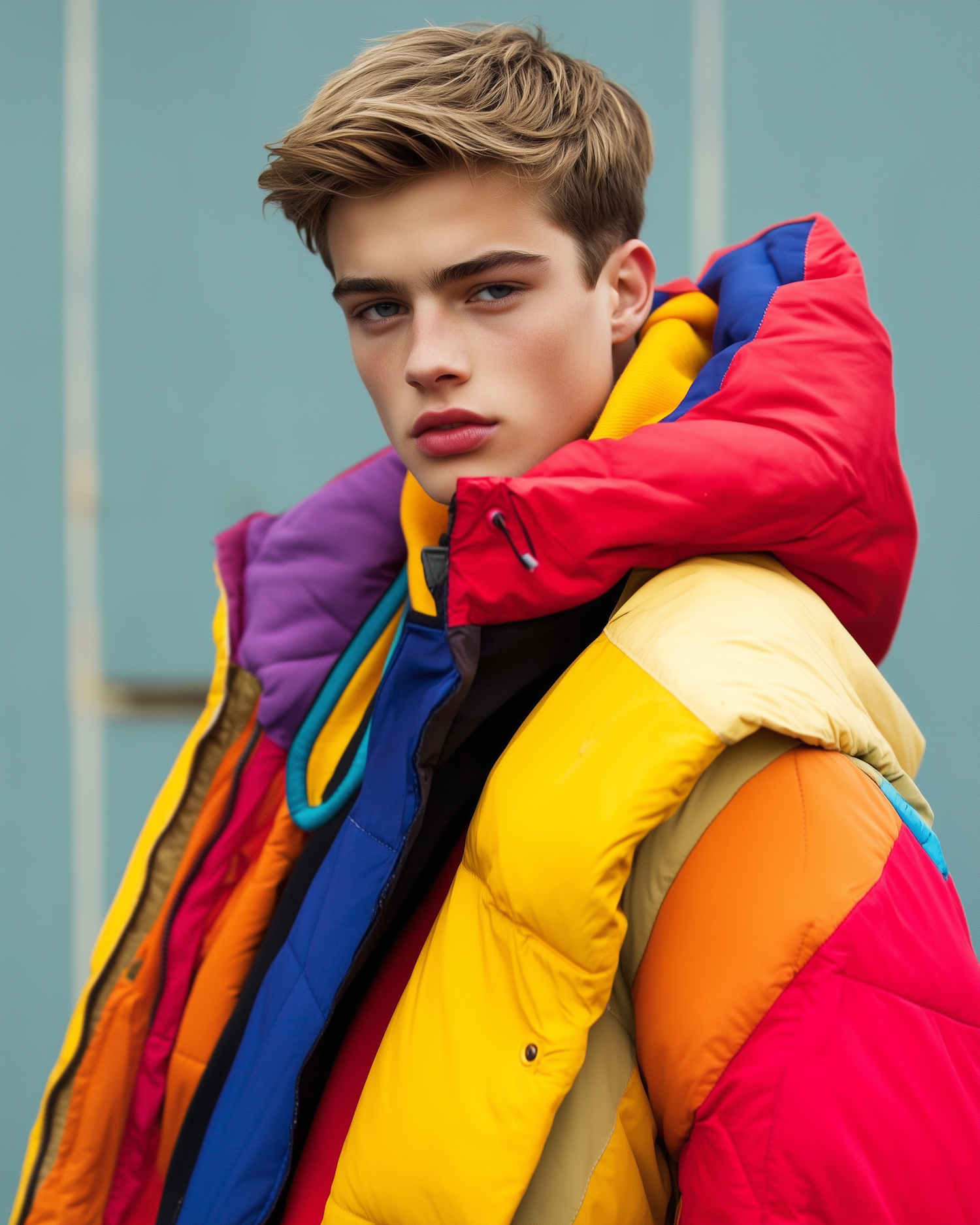 Young man in a colorful puffer jacket against a teal background, showcasing vibrant fashion and modern style.