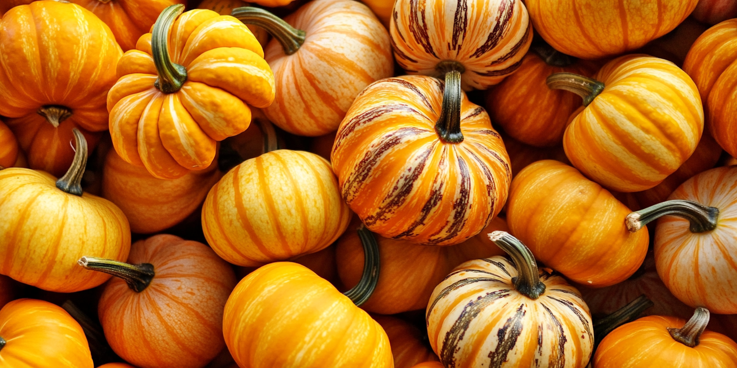 A vibrant assortment of small, striped pumpkins in warm orange hues, perfect for autumn and Halloween decor.