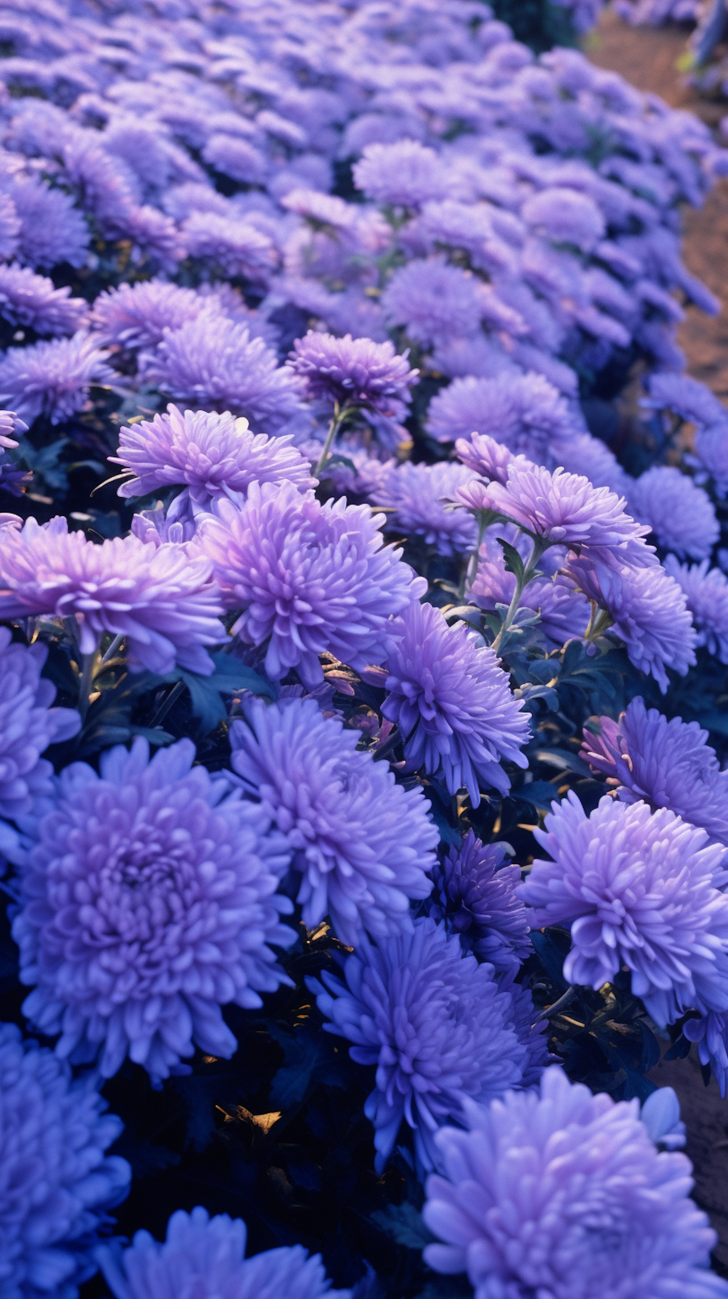 A lush field of vibrant purple chrysanthemums in full bloom, creating a serene and colorful landscape.