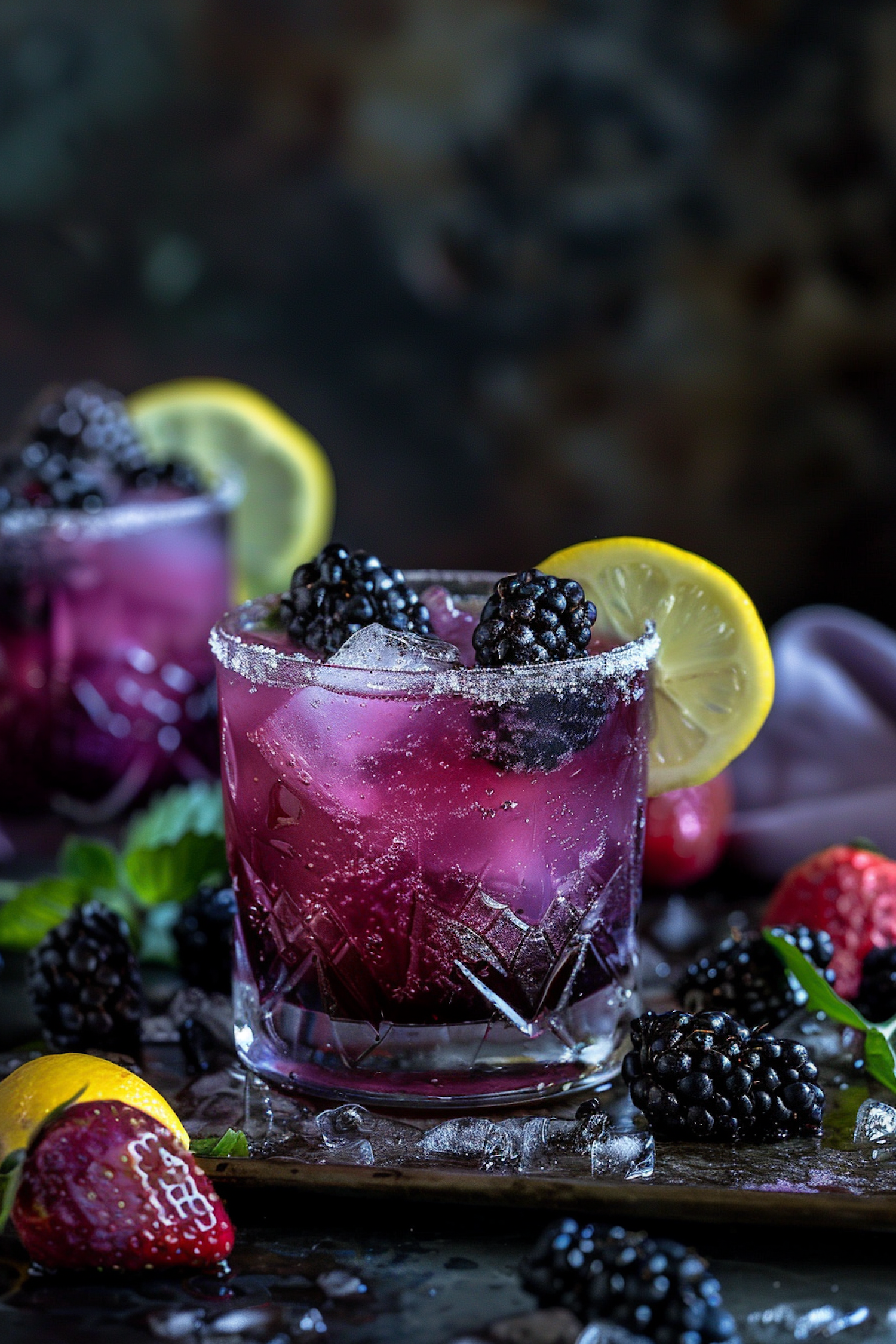Refreshing blackberry cocktail with lemon slice and sugar rim, surrounded by fresh berries and ice on a dark background.