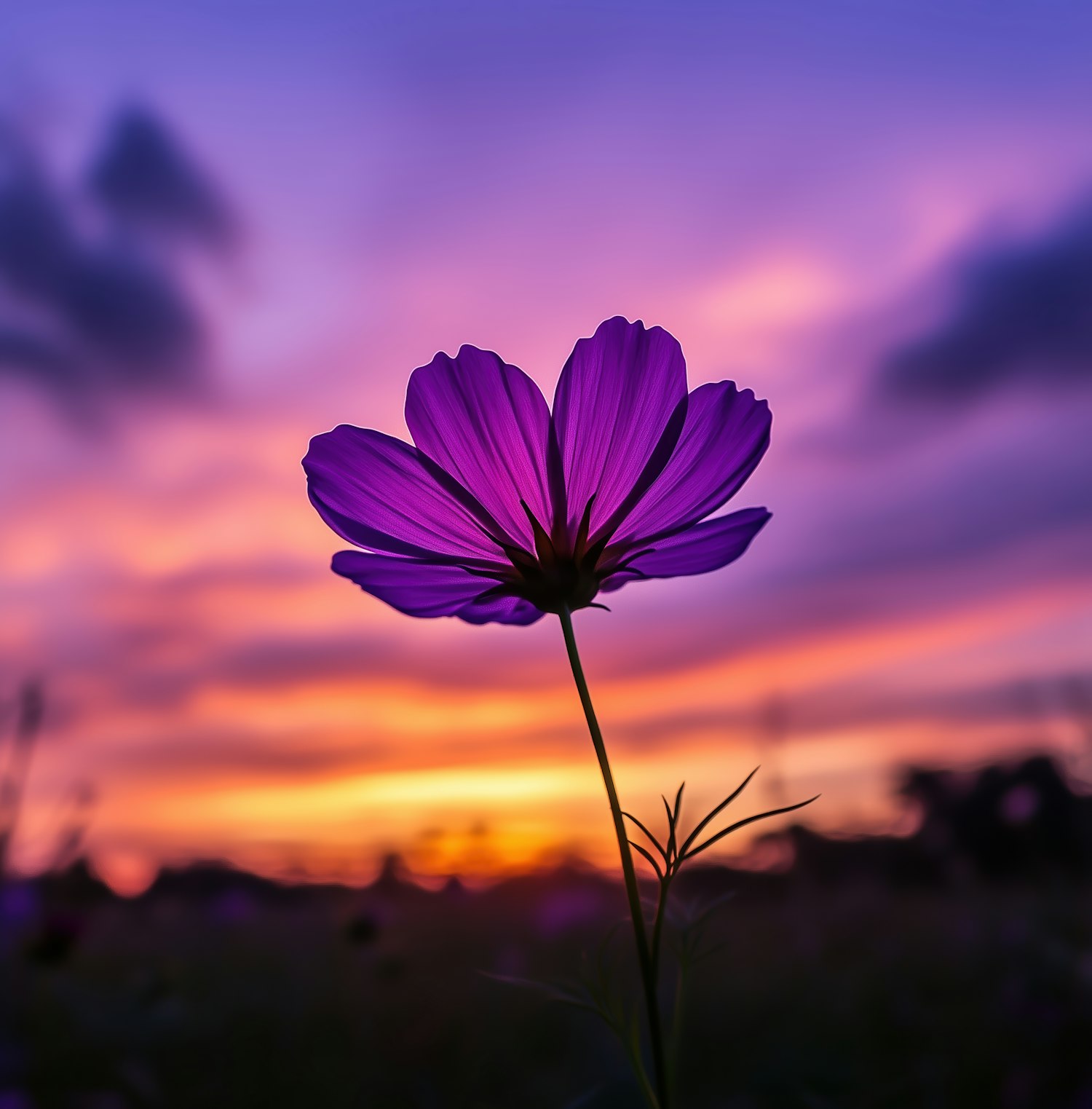 Vibrant purple flower against a stunning sunset, with vivid colors and a serene atmosphere.