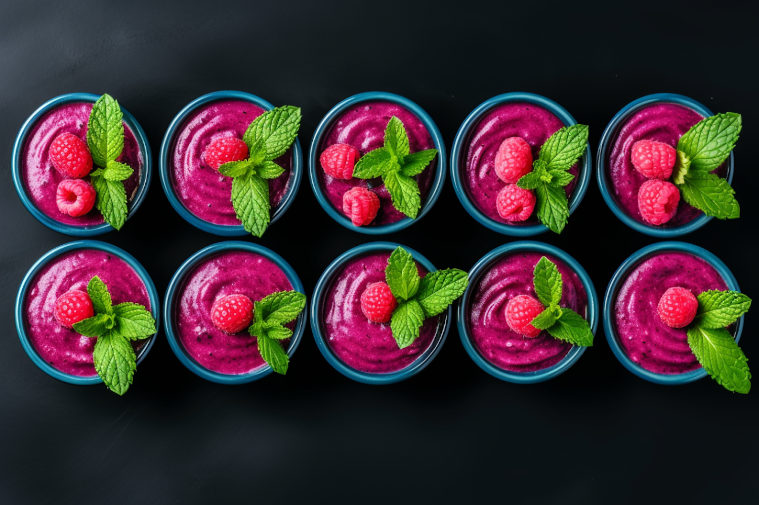 Vibrant magenta smoothies in blue bowls, topped with fresh raspberries and mint, arranged in two neat rows on a dark surface.