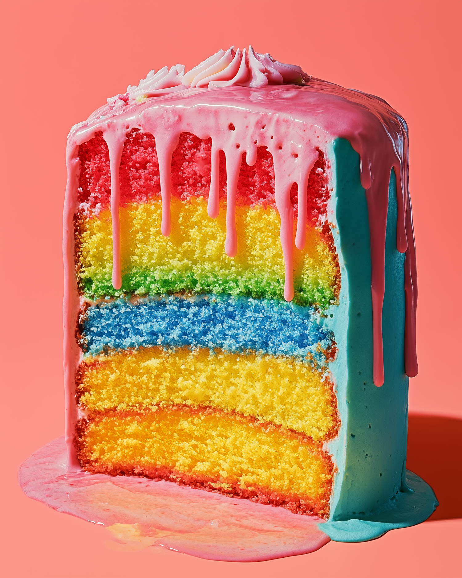 Vibrant rainbow cake with pink icing drips, featuring colorful layers against a coral background. A visually delightful dessert.