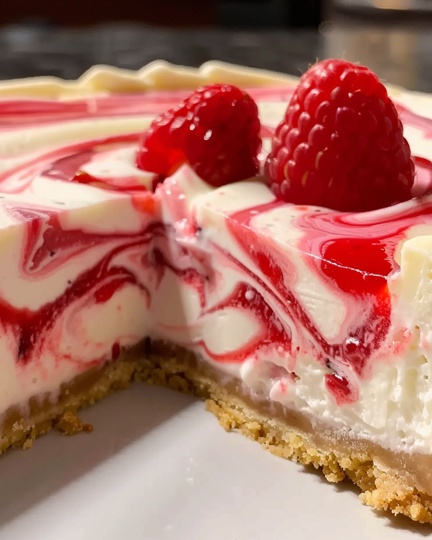 Close-up of a raspberry swirl cheesecake with a graham cracker crust, topped with fresh raspberries and a glossy marbled finish.