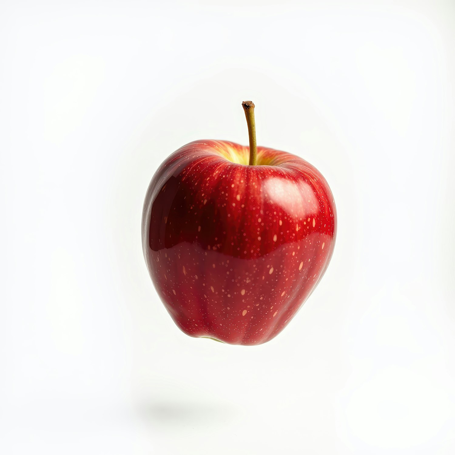 A glossy red apple floats against a white background, showcasing its vibrant color and smooth texture.