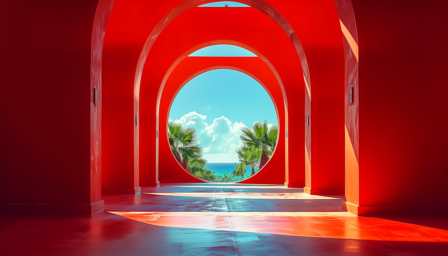 Vibrant red arches frame a stunning ocean view with palm trees and a bright blue sky, creating a striking architectural scene.