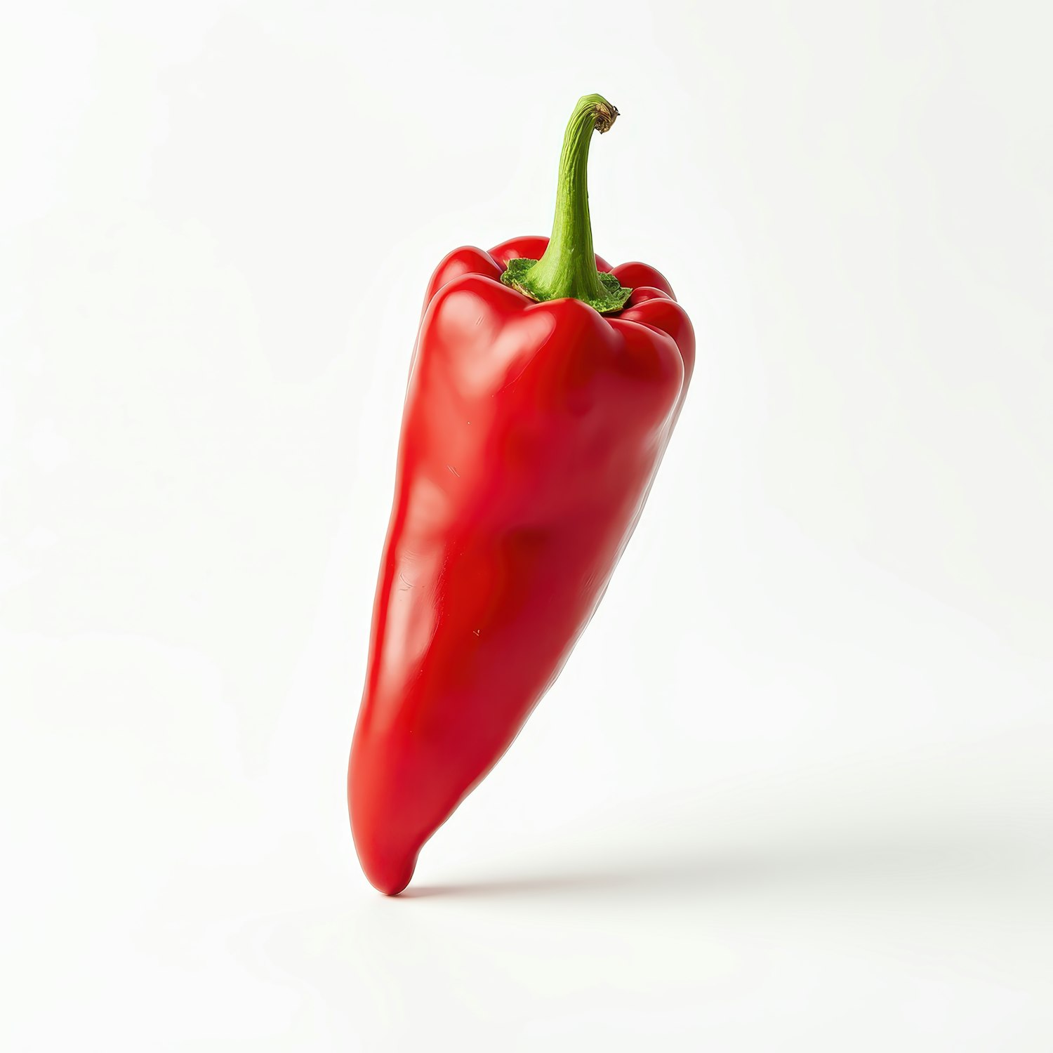 A fresh, glossy red bell pepper with a green stem, isolated on a white background, highlighting its vibrant color and smooth texture.
