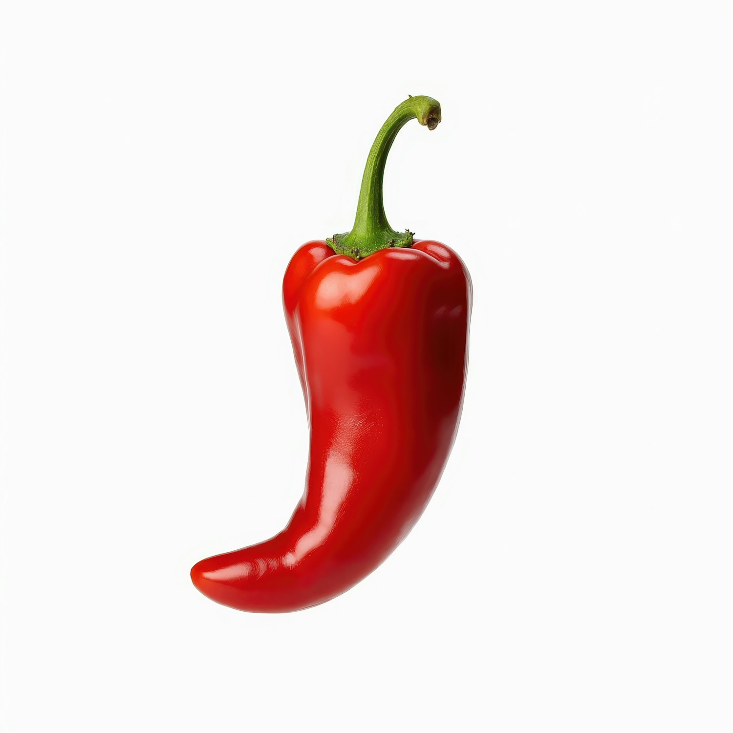 Vibrant red chili pepper with a glossy surface and green stem on a plain white background, highlighting its fresh appearance.