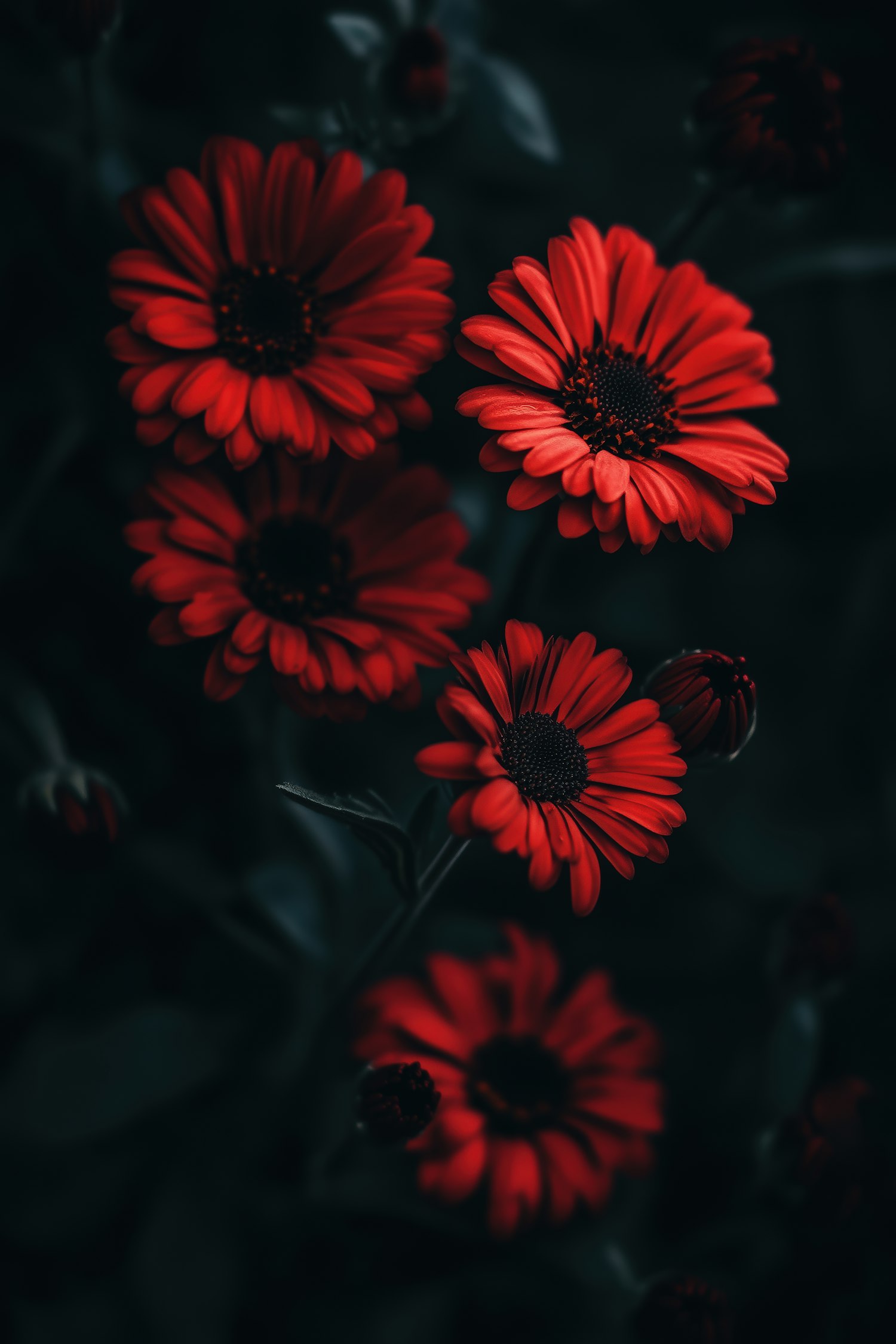 Vivid red daisies with black centers pop against a dark, moody background, creating a dramatic and elegant floral composition.