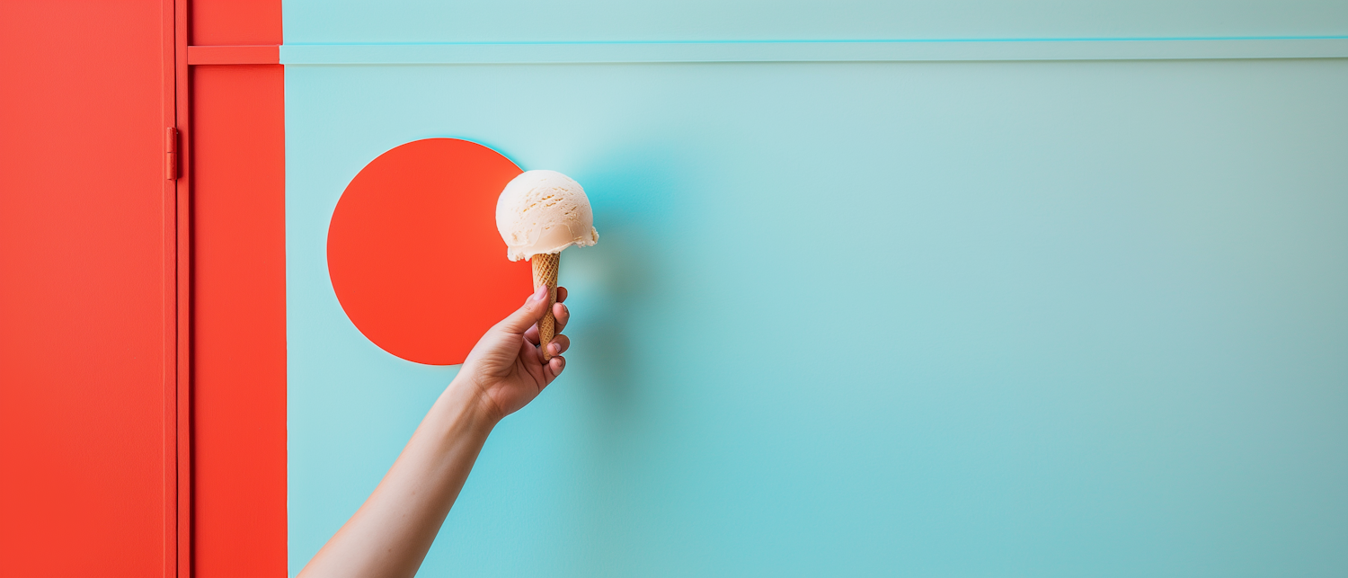 Minimalist image of a hand holding an ice cream cone against a vibrant red and blue background with geometric shapes.