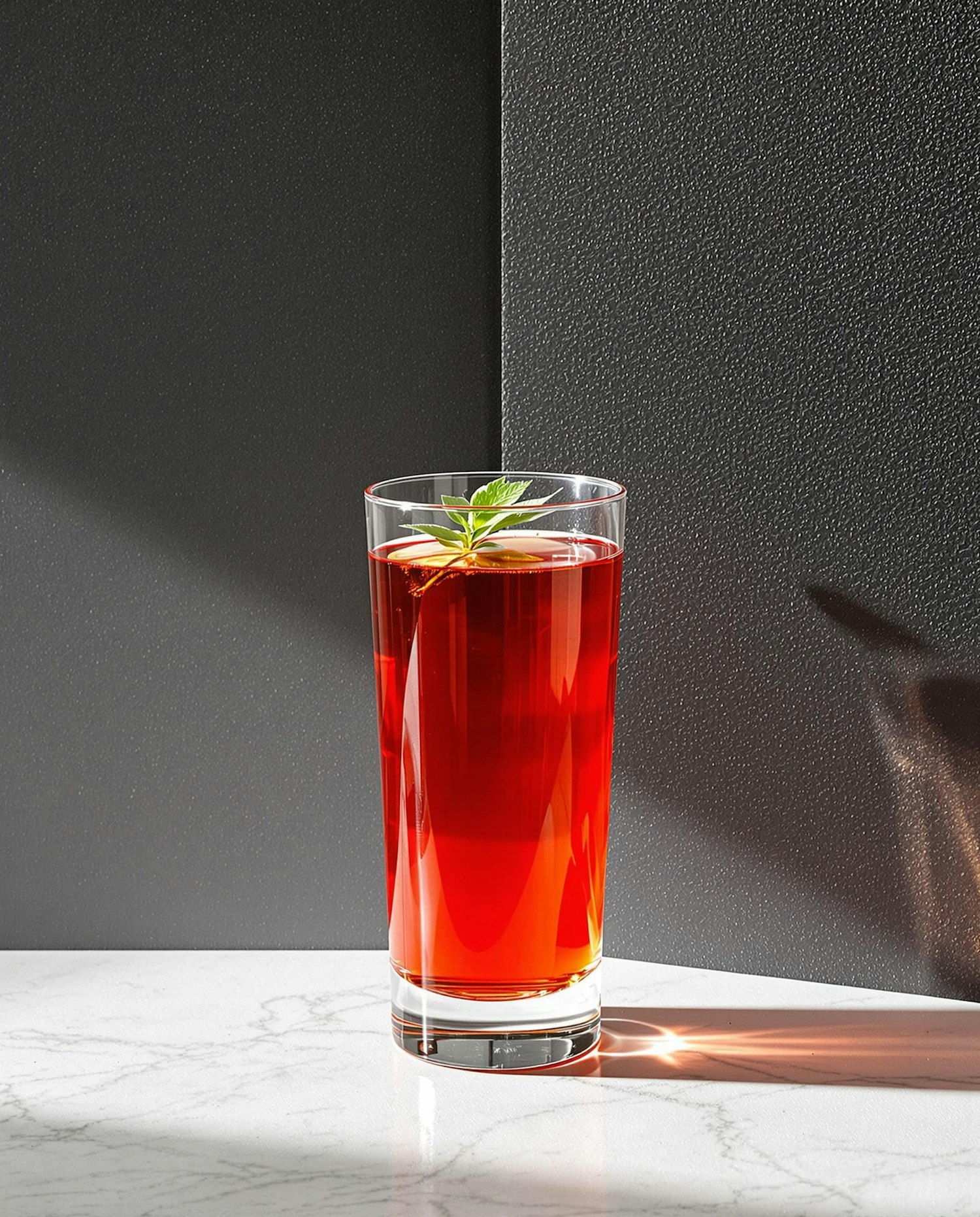 A chic cocktail with vibrant red color and mint garnish, set against a dark background and marble surface. Elegant and refreshing.