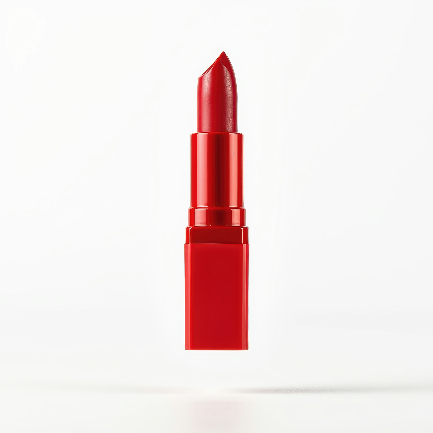Vibrant red lipstick with glossy finish on a white background, highlighting its rich color and elegant design.