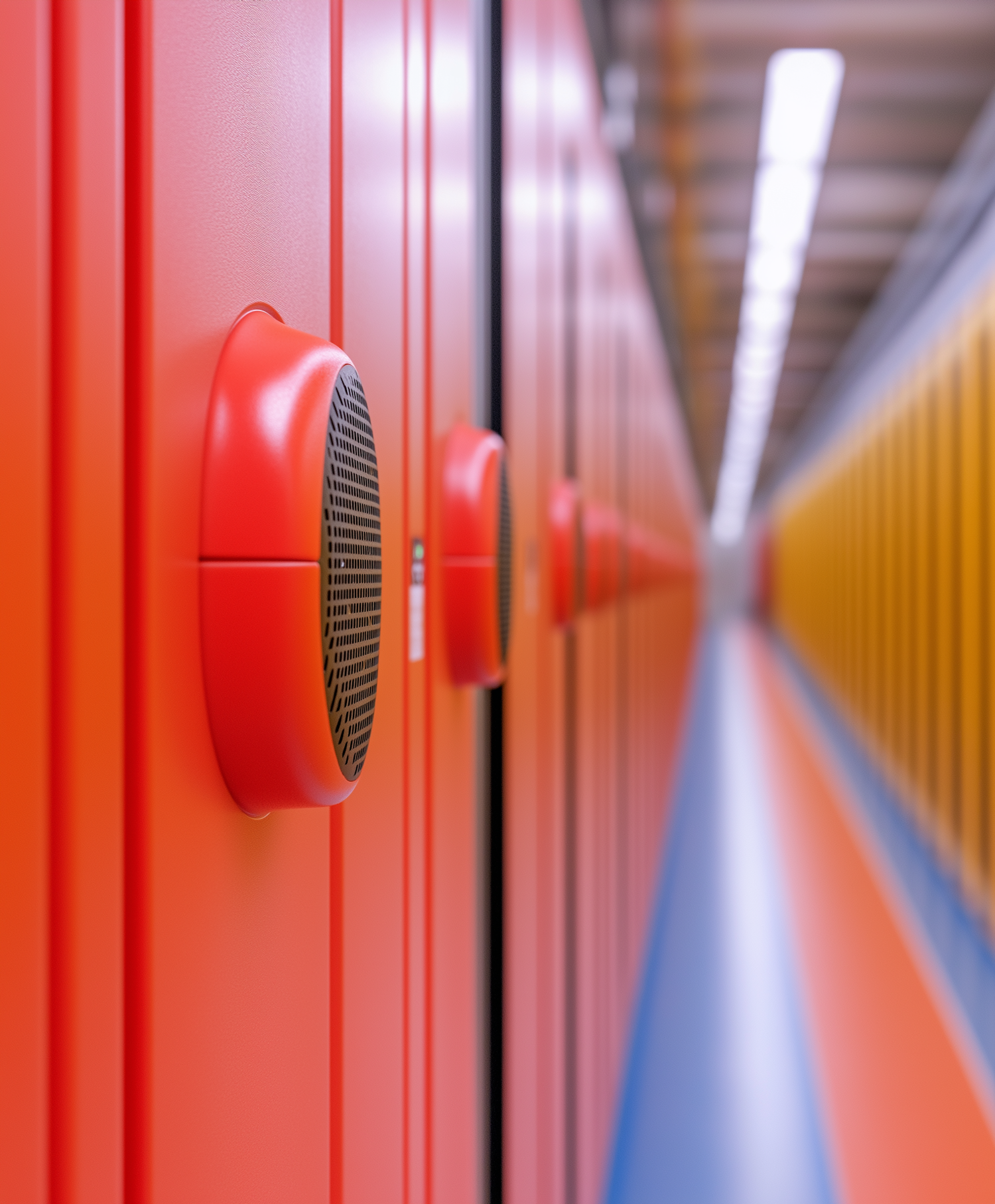 Vibrant orange lockers with red ventilation grilles create a modern, organized look. Bright lighting enhances the colorful design.