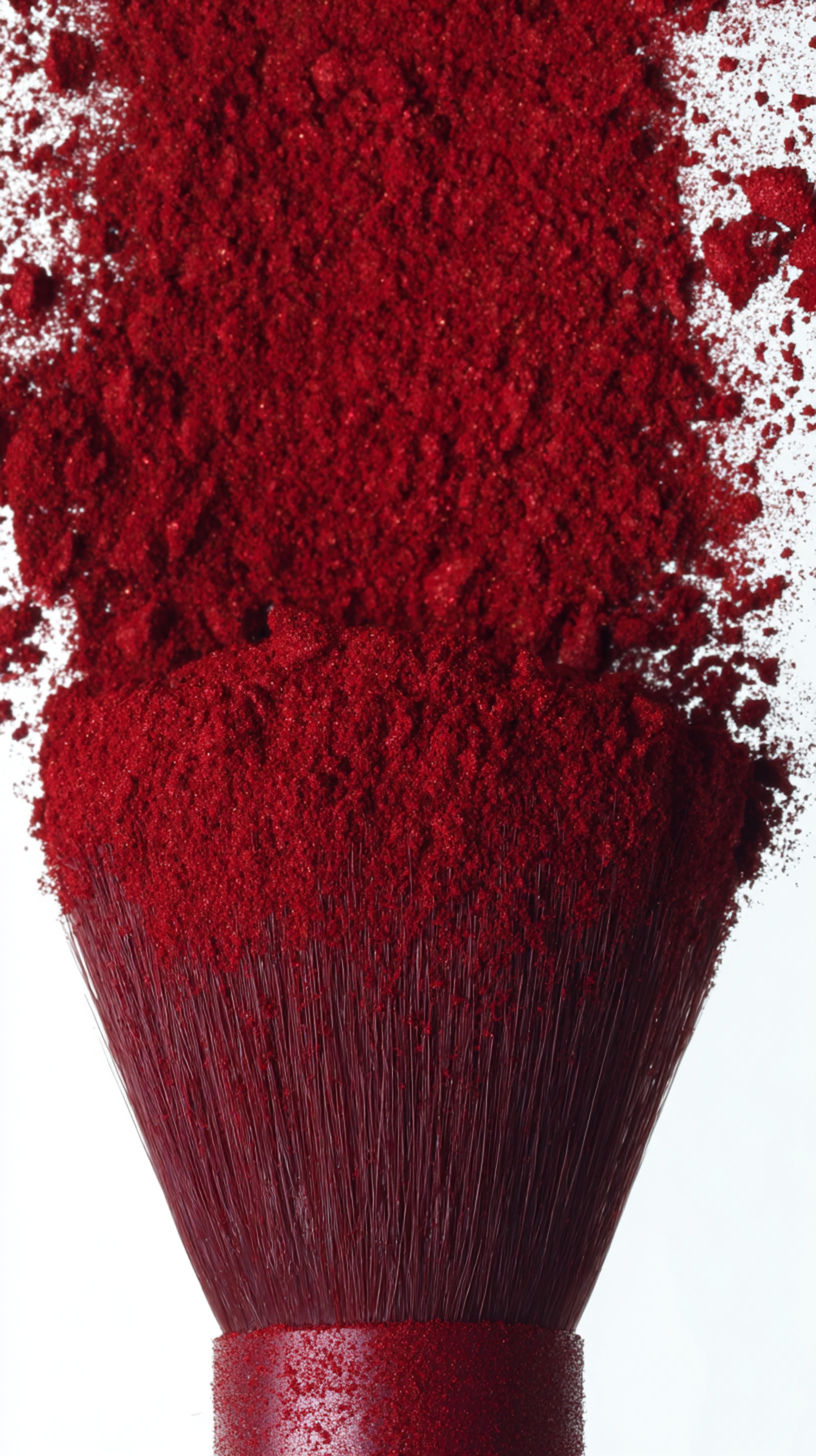 A close-up of a makeup brush with vibrant red powder cascading over its bristles, creating a dynamic and colorful visual.