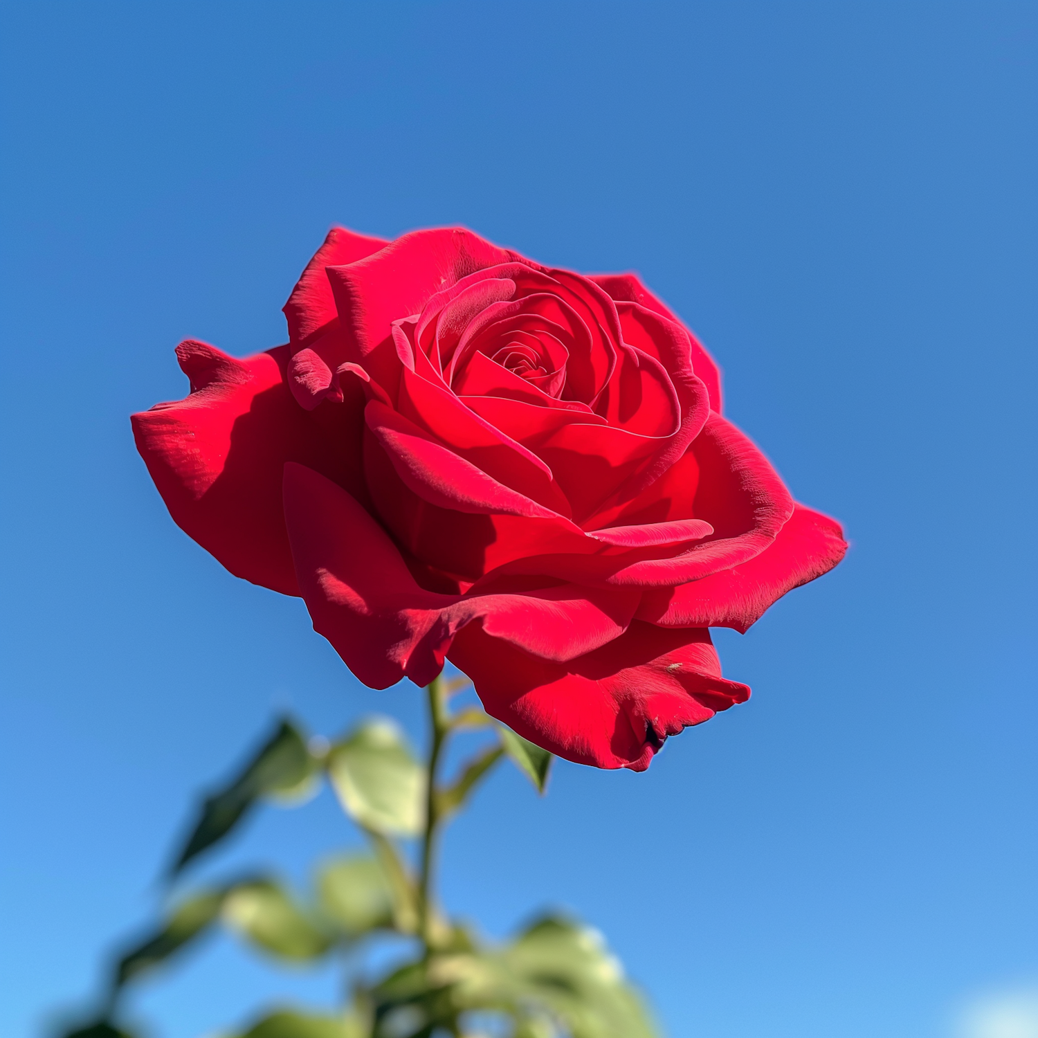 Vibrant red rose against a clear blue sky, showcasing rich petals and natural beauty in a striking contrast.