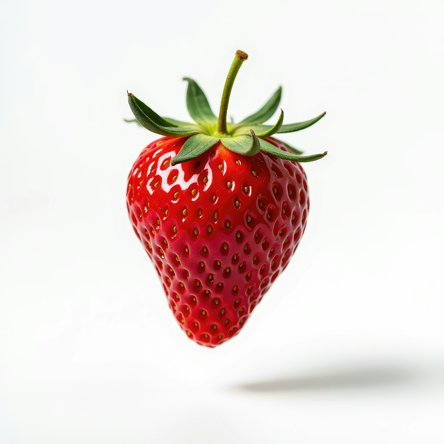 A vibrant red strawberry floating against a white background, showcasing its glossy texture and fresh green calyx.