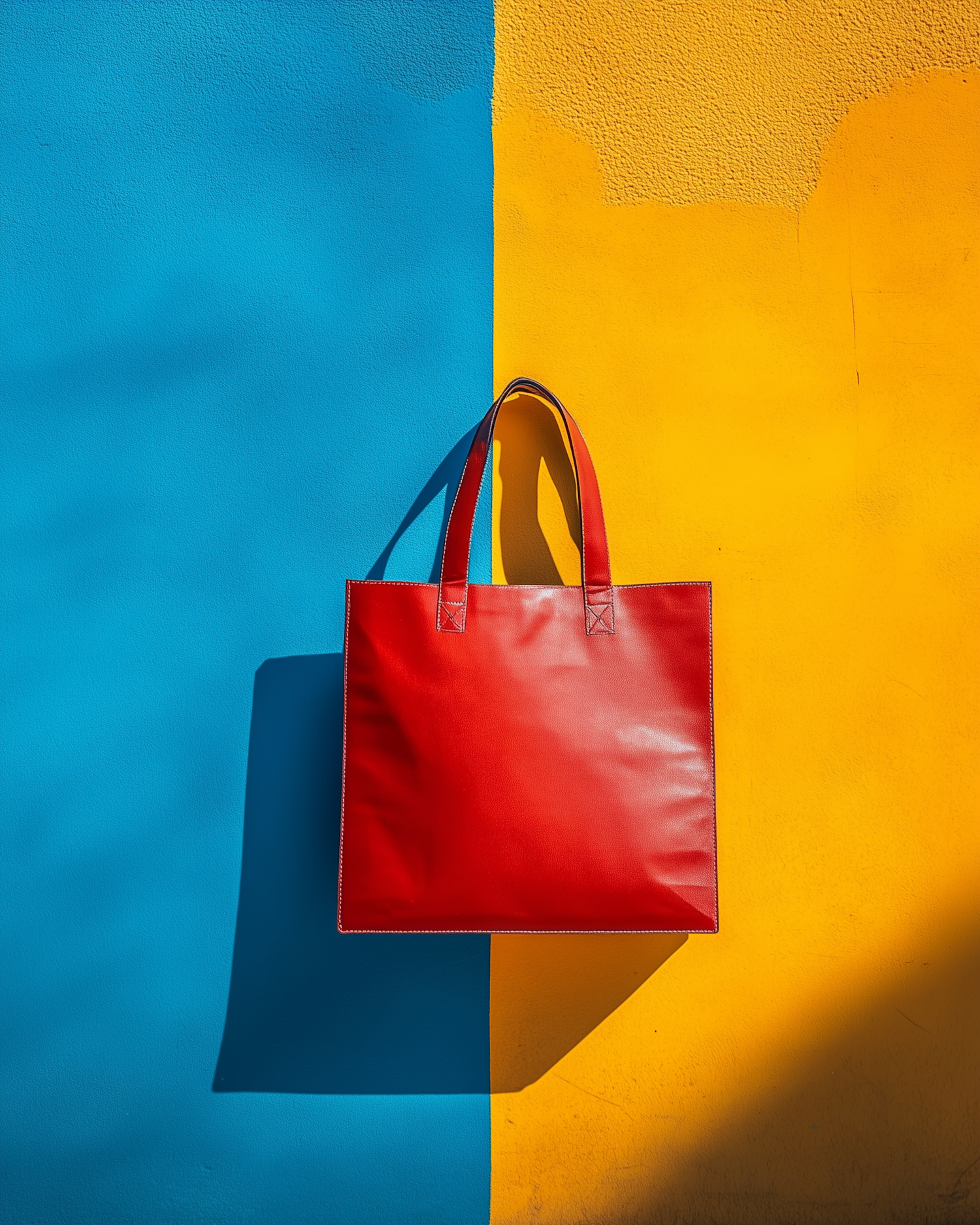 Red leather tote bag against a vibrant blue and yellow background, creating a striking minimalist composition.
