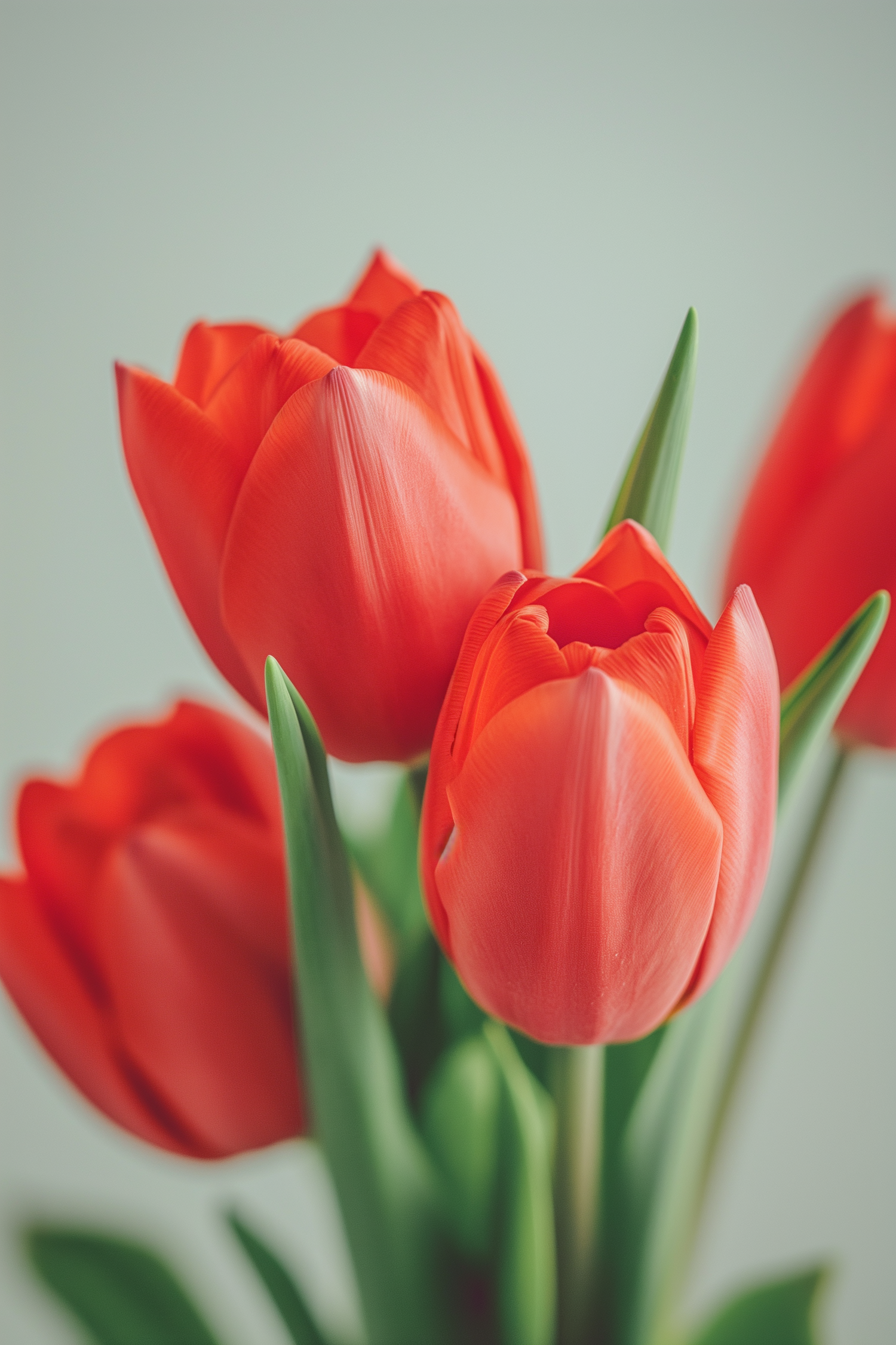 Close-up of vibrant red tulips with green stems against a soft green background, highlighting their delicate petals and rich color.