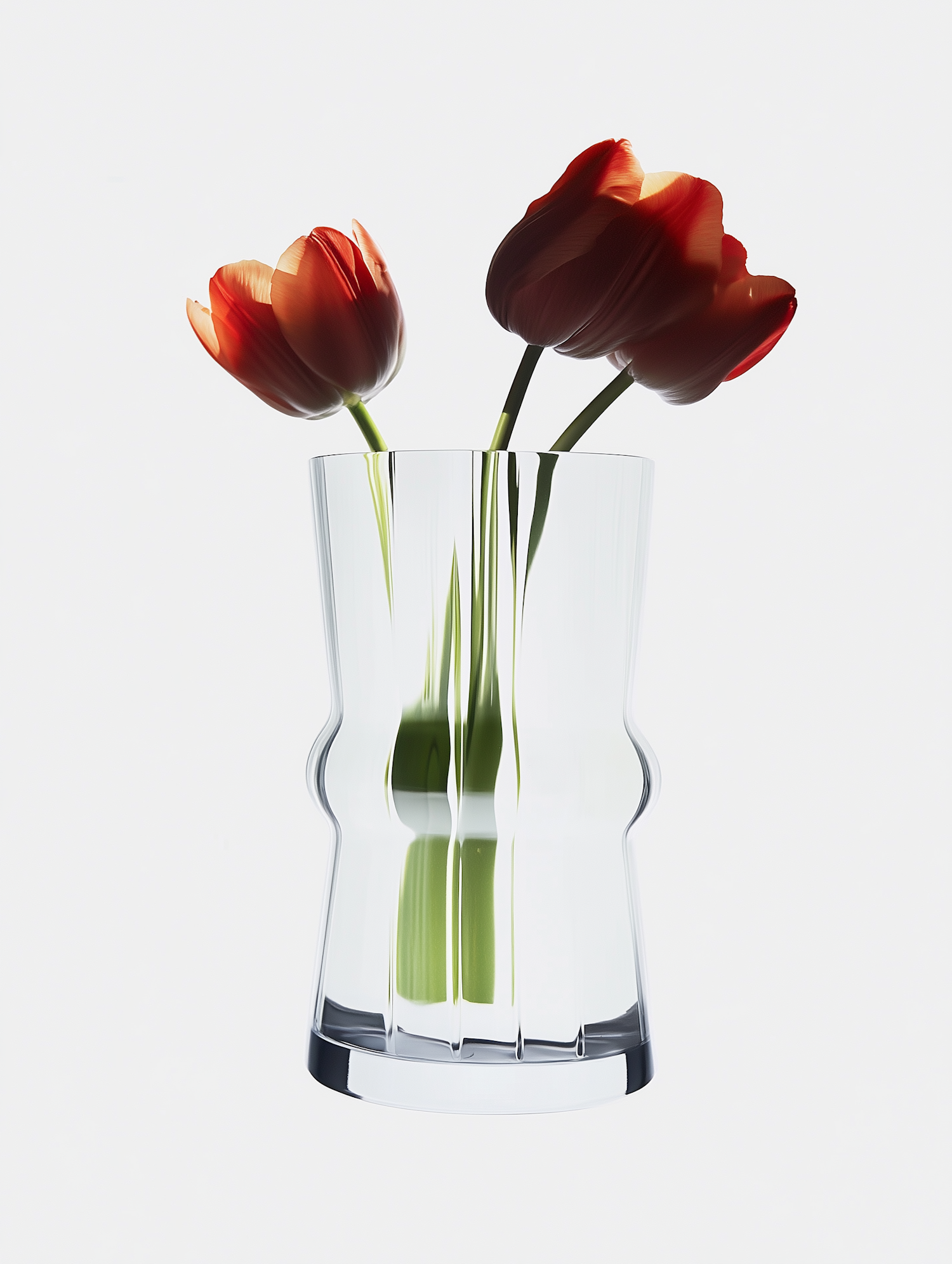 Elegant glass vase with two vibrant red tulips, showcasing a modern design and vivid colors against a soft background.