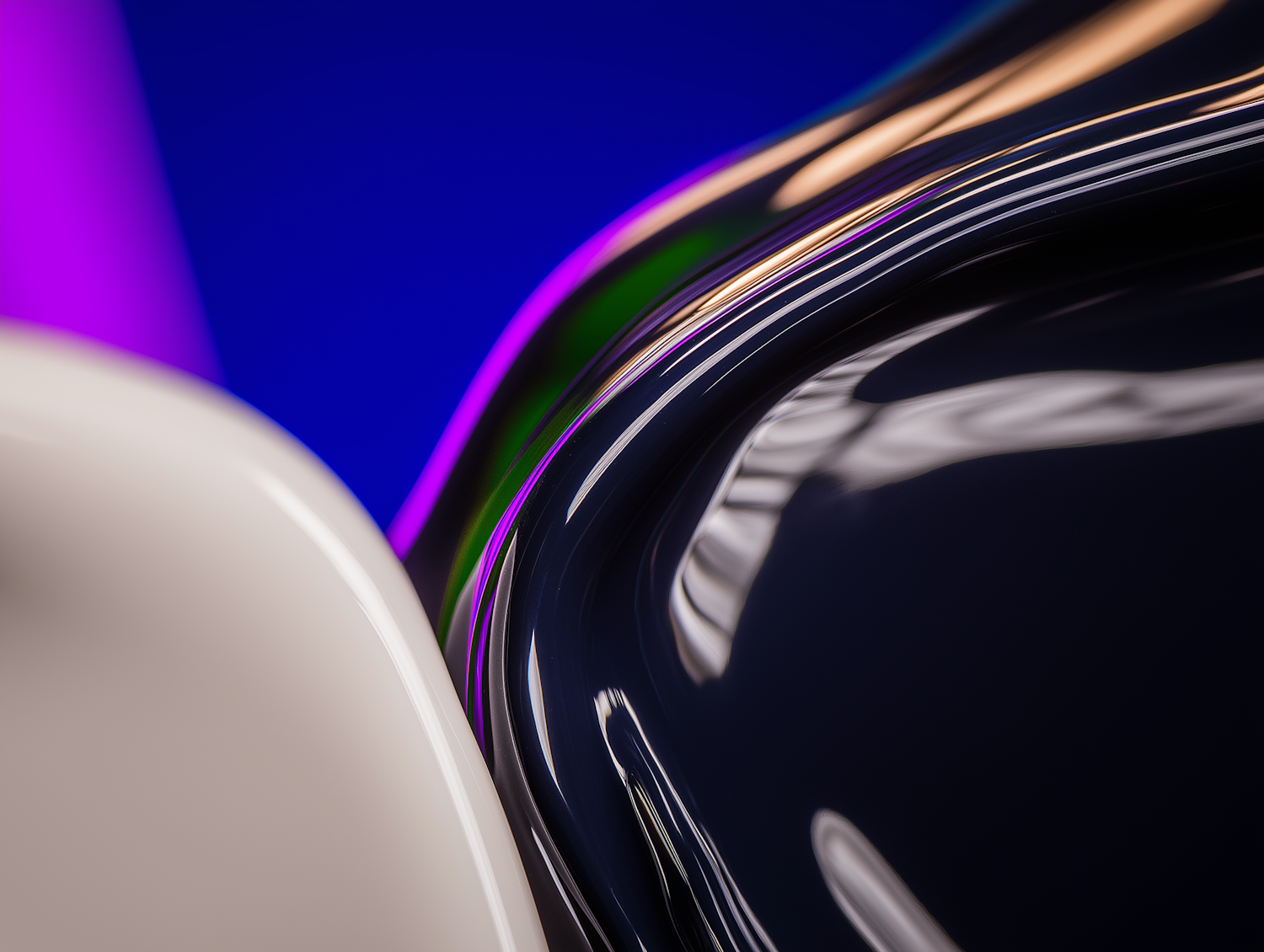 Abstract close-up of glossy curved surfaces reflecting vibrant purple, blue, and green hues with dynamic light interplay.