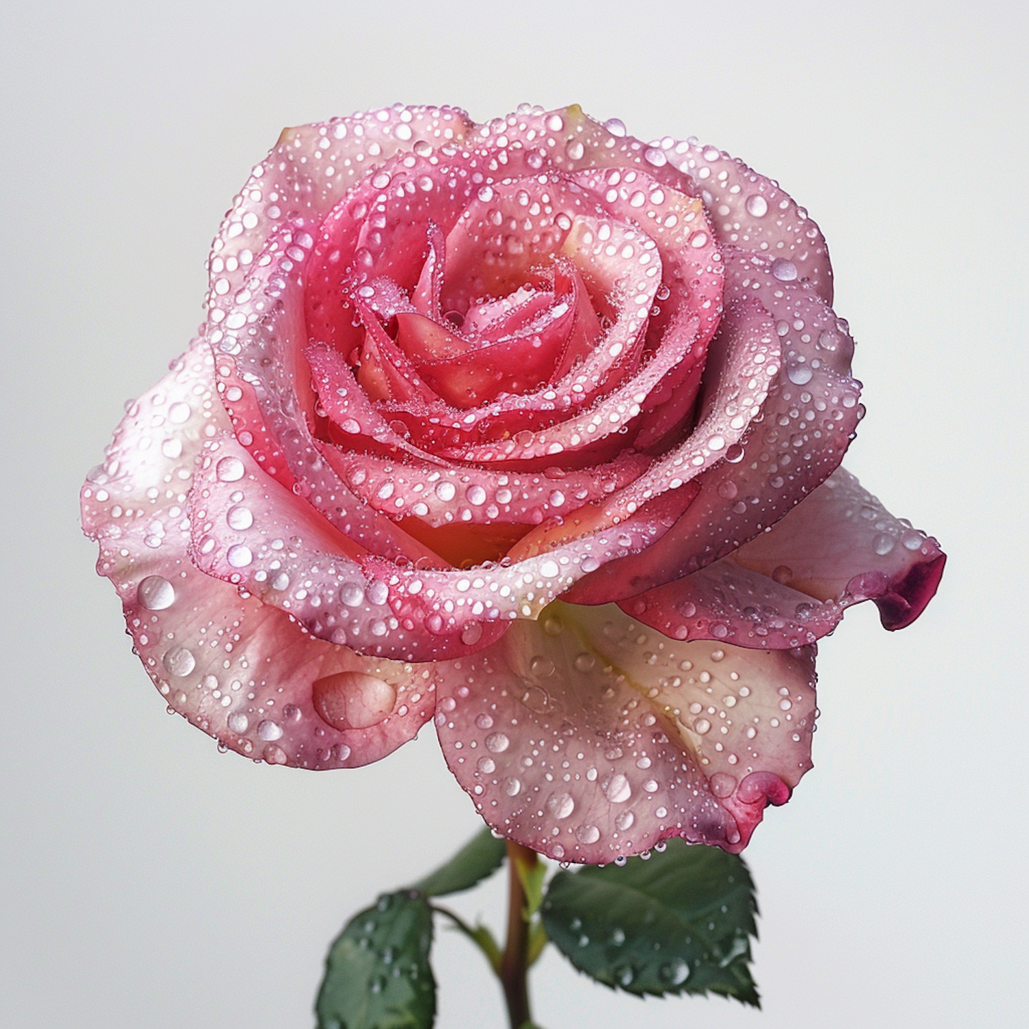 Close-up of a pink rose with dewy petals against a soft gray background, highlighting its vibrant color and delicate texture.